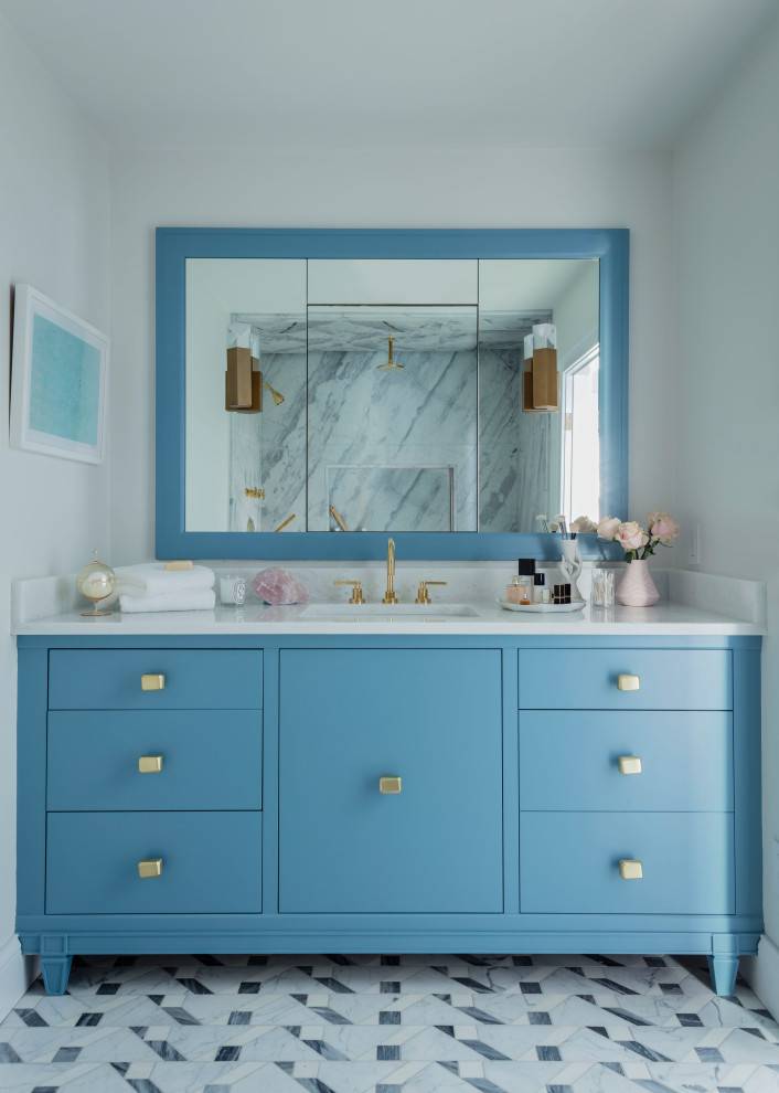 Blue Jean của Benjamin Moore là một màu sắc tươi mới, toát lên vẻ thanh lịch và phong cách. Sắc màu trung tính nhẹ nhàng mang lại cảm giác yên bình và dịu nhẹ, đồng thời vẫn toát lên vẻ tinh tế. Nếu bạn cảm thấy màu này hơi quá nổi bật trên tường, bạn luôn có thể sử dụng ở mức độ vừa phải. Ví dụ, hãy sơn bàn trang điểm với tông màu xanh dương dễ chịu này để mang đến sự tươi mới cho không gian. Chúng tôi yêu thích cách phụ kiện mạ vàng và mặt bàn đá cẩm thạch hoàn thiện vẻ ngoài, tạo nên một thiết kế phòng tắm thanh lịch với điểm nhấn tươi mới.