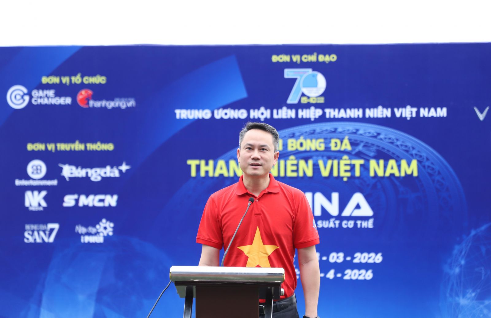 Anh Nguyễn Kim Quy, Phó Chủ tịch Thường trực Trung ương Hội LHTN Việt Nam phát biểu khai mạc Giải bóng đá Thanh niên Việt Nam - Cúp Asina 2026.