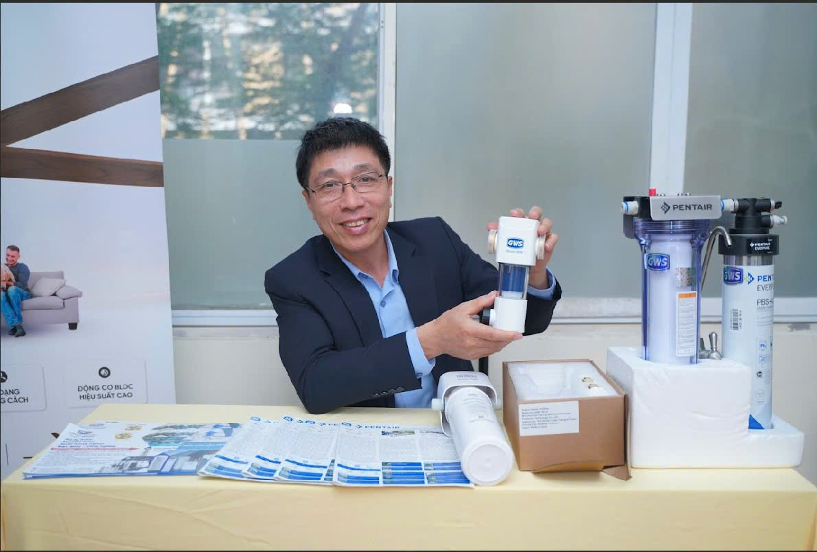 Gian hàng máy lọc nước giới thiệu các mẫu thiết bị lọc RO thế hệ mới, phù hợp cho căn hộ nhà ở xã hội tại Hội thảo CONTECH+2025.