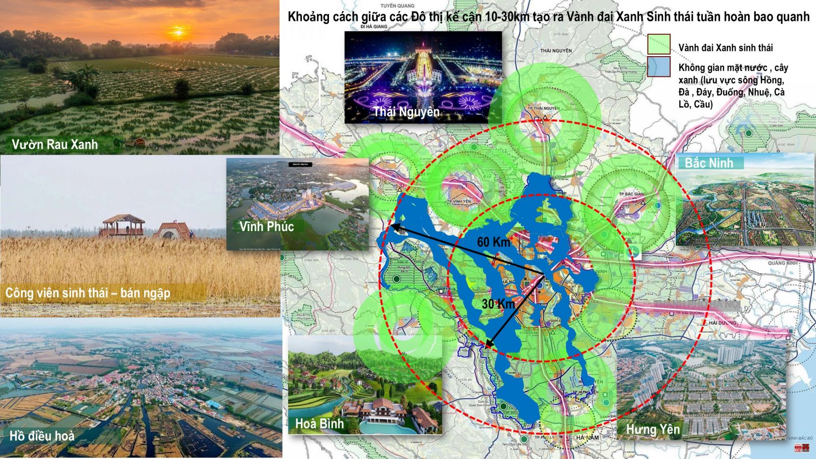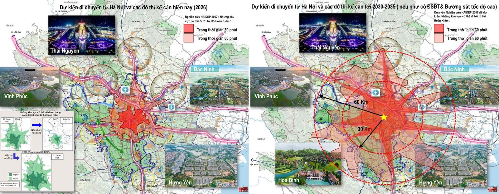City Solution đã sớm nhận thấy hạn chế của định hướng liên kết vùng không đạt yêu cầu do lấy cơ sở kết nối bằng đường bộ, tốc độ thấp, bán kính vùng <30km, dẫn đến một chuỗi đề xuất tiếp theo không đạt yêu cầu (Pano3, 4, 5, 6, 7, 8, 9, 10 của TLQH). City Solution đã tiếp cận nội dung liên kết vùng bằng đường sắt liên vùng, liên vận quốc tế tốc độ cao (160km/h) hiện đã khởi động tuyến Lào Cai-Hà Nội-Hải Phòng, Hà Nội-Gia Bình-Hạ Long, Hà Nội-Lạng Sơn và Đường sắt cao tốc Bắc Nam… để định hướng liên kết vùng. Nếu với Đường sắt tốc độ cao 160km/giờ, tốc độ khai thác thương mại 100km2 thì các đô thị kế cận có khoảng cách kết nối trung tâm Hà Nội tăng lên R= 60km-100km.