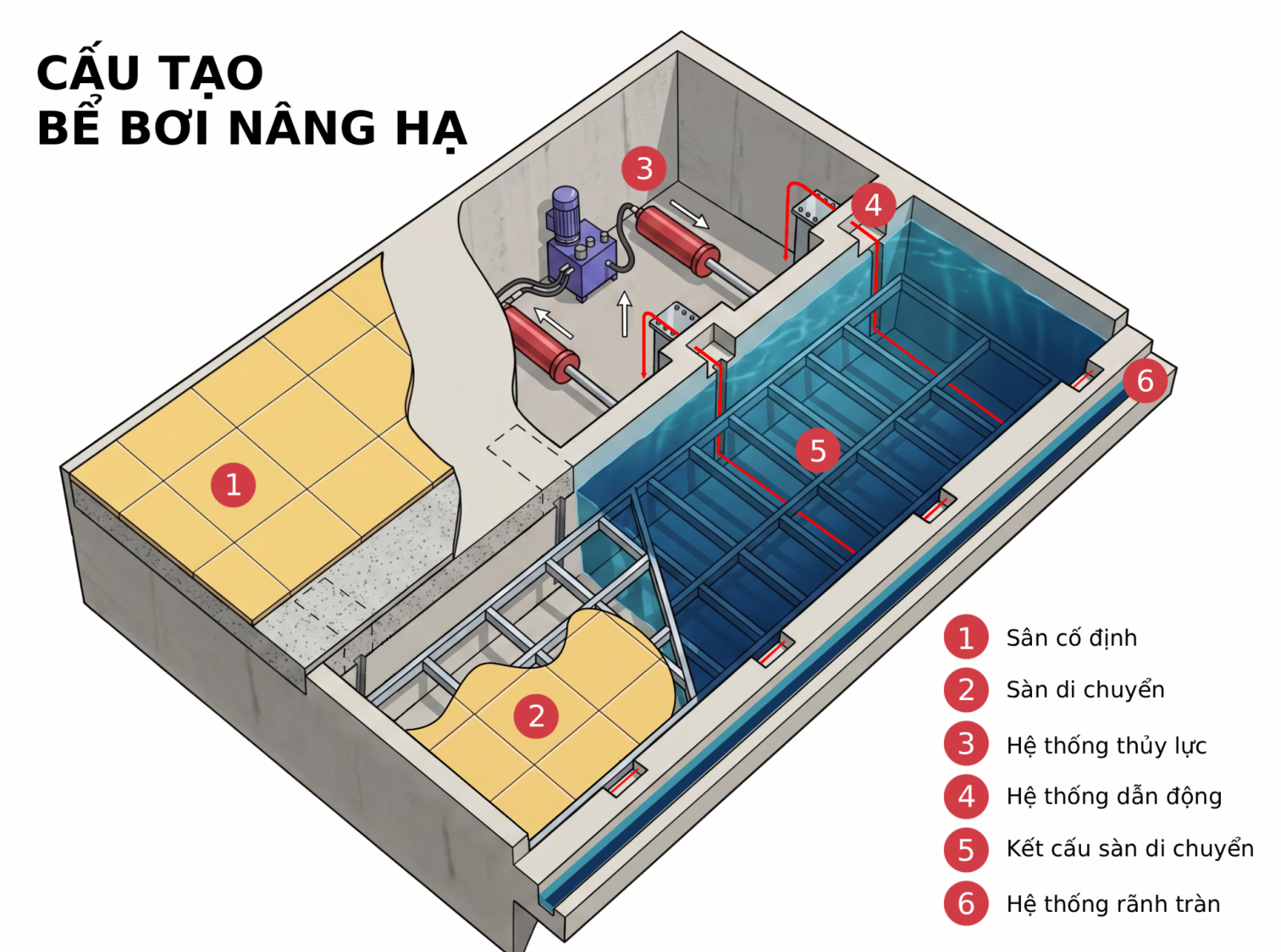 Cấu tạo hệ thống nâng hạ bể bơi : 3 nhóm cấu tạo chính