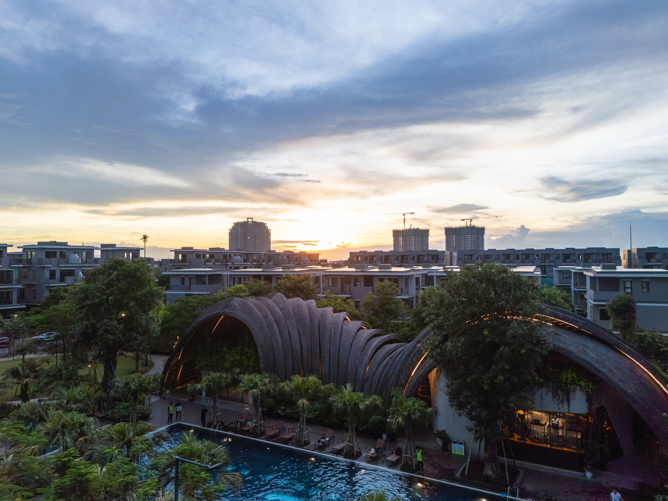 Dòng chảy hình khối: Từ núi đến mái vòm – Lấy cảm hứng từ những đường nét hùng vĩ của thiên nhiên và văn hóa vùng Lam River, các kiến trúc sư đã tạo ra một khối kiến trúc phi tuyến tính, thách thức sự góc cạnh của môi trường đô thị. Công trình cao 8m này không phải là một câu lạc bộ thông thường, mà là một vỏ sò khổng lồ hay một dòng chảy kiến trúc uốn lượn quanh hồ bơi.