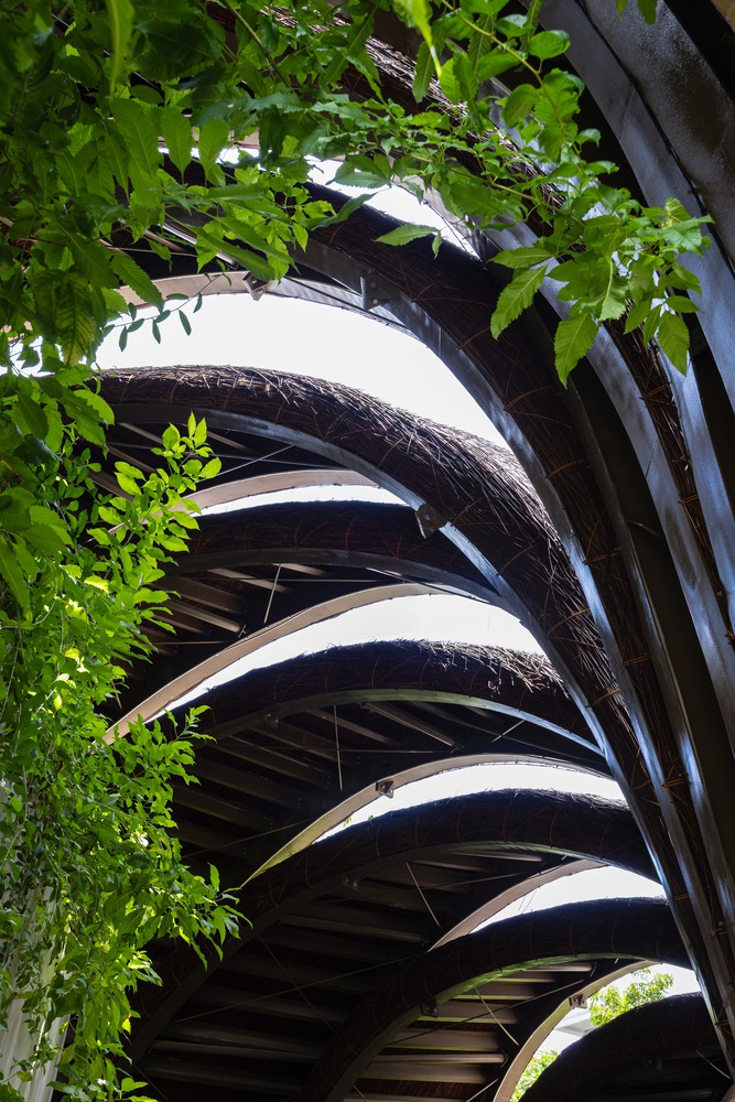 1. Mái Guột – Lớp vỏ hữu cơ: Thay vì sử dụng vật liệu công nghiệp, mái nhà được phủ bằng Gleicheniaceae (guột), một vật liệu tự nhiên được chế tác thủ công. Lớp vỏ tự nhiên này không chỉ che phủ mà còn hoạt động như một bộ lọc vi khí hậu, giữ cho không gian bên dưới mát mẻ và mang lại cảm giác độc đáo khi chạm vào. Theo thời gian, mái guột sẽ thay đổi màu sắc, hòa quyện hơn nữa vào lớp thảm thực vật xanh tươi bám vào nó.