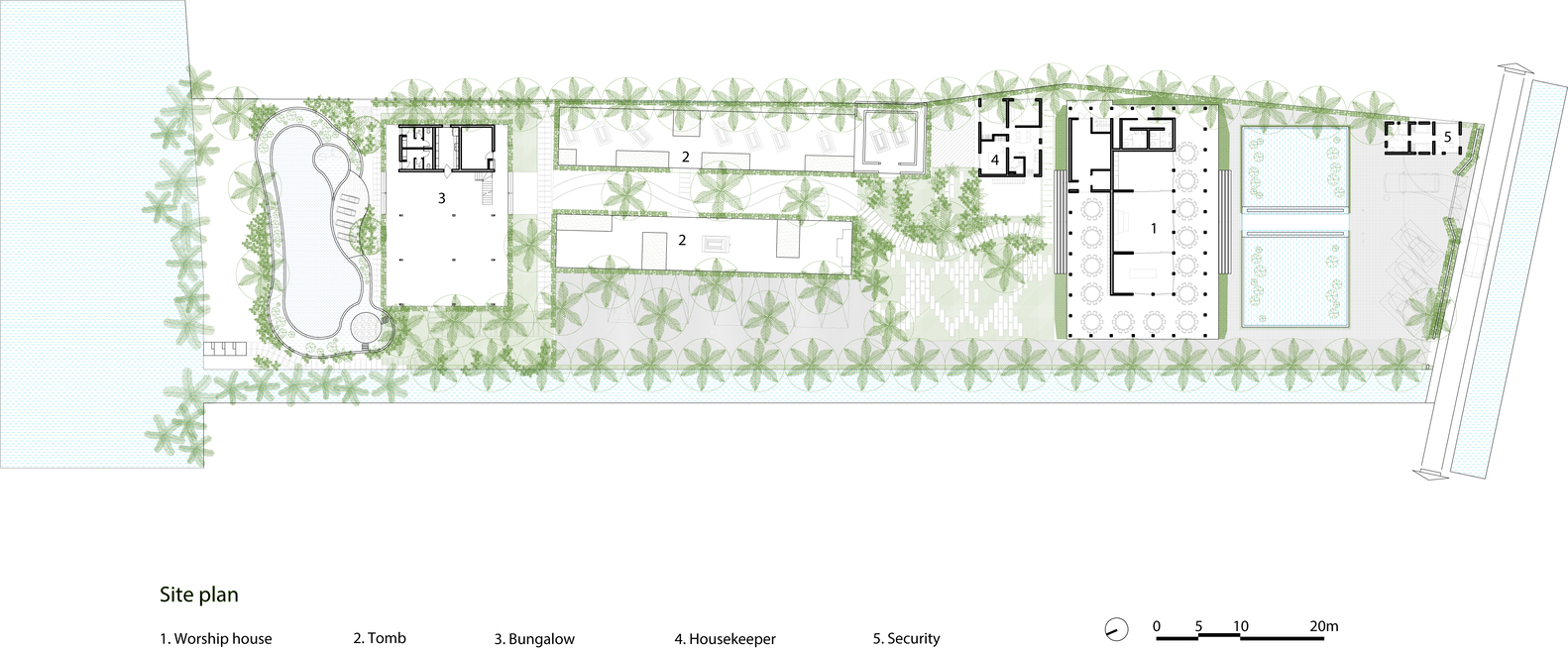 Ngôi chùa và nhà thờ tổ tiên tạo nên sự hài hòa tuyệt vời với cảnh quan thiên nhiên xung quanh gồm những hàng dừa địa phương. Chúng tôi nỗ lực bảo tồn hiện trạng tổng thể của rừng dừa bằng cách trồng lại những cây đã bị chặt bỏ trong quá trình xây dựng.