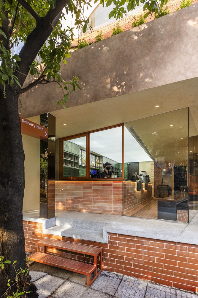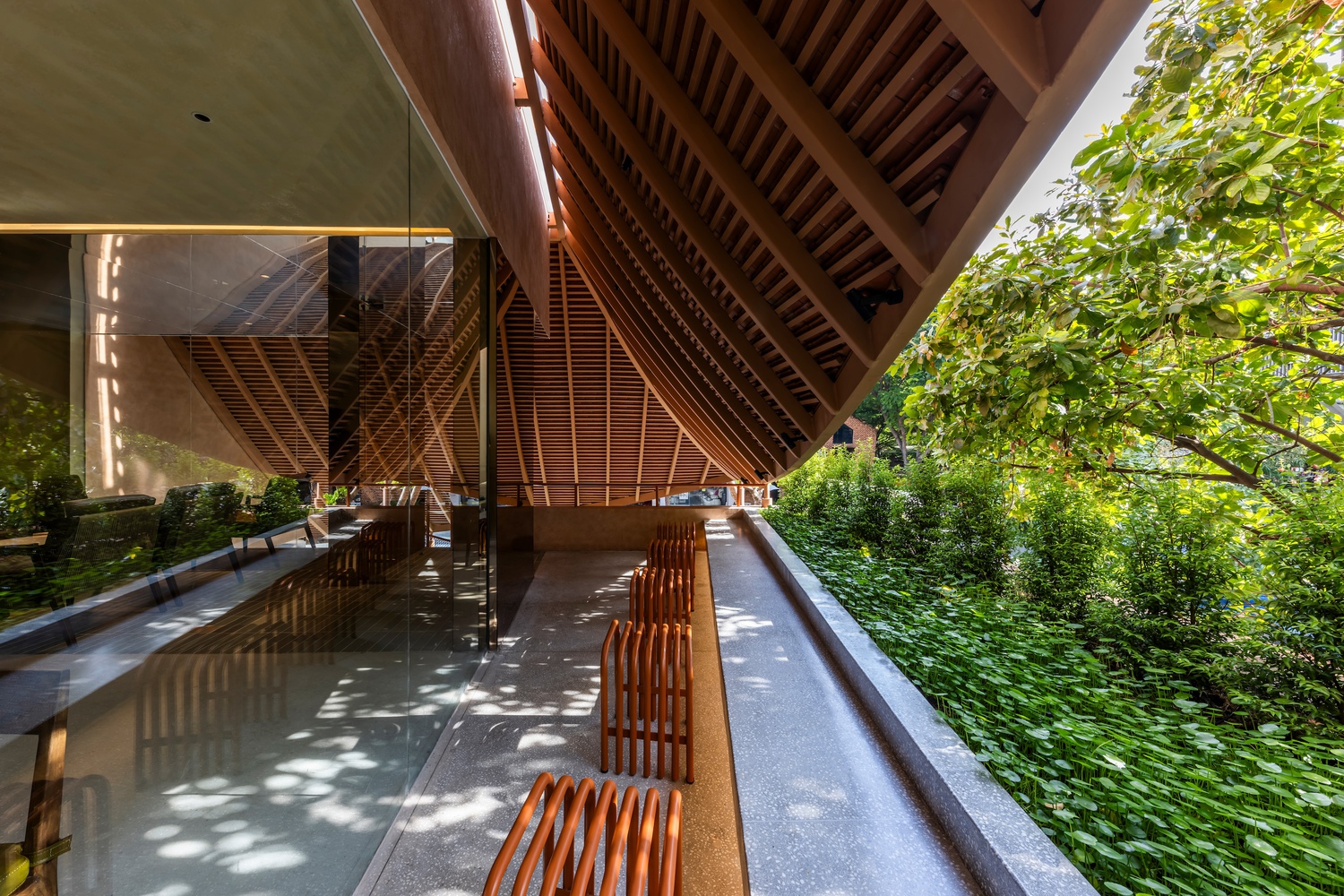 Điểm nhấn nổi bật nhất chính là mái nhà rộng lớn lấy cảm hứng từ kiến trúc truyền thống Việt Nam. Được uốn cong duyên dáng và vươn ra phía ngoài tại góc ngã tư, mái nhà không chỉ đóng vai trò là điểm nhấn kiến trúc mà còn kết nối không gian nội thất và ngoại thất, thu hút sự chú ý và tạo nên sự tương tác với cảnh quan đường phố. Mái nhà cũng kết nối với tầng hai, tạo nên một hiên nhà thoáng mát, mang đến cho du khách trải nghiệm linh hoạt và sảng khoái. Không chỉ là một biểu tượng gợi nhớ đến hình khối truyền thống, thiết kế này còn thể hiện tinh thần đổi mới và khám phá văn hóa sâu sắc hơn. Do đó, các yếu tố như hiên nhà râm mát, mặt nước phản chiếu và ghế ngồi thấp được kết hợp để gợi lên cảm giác hoài niệm và mang đến một cử chỉ ấm áp, chào đón du khách.