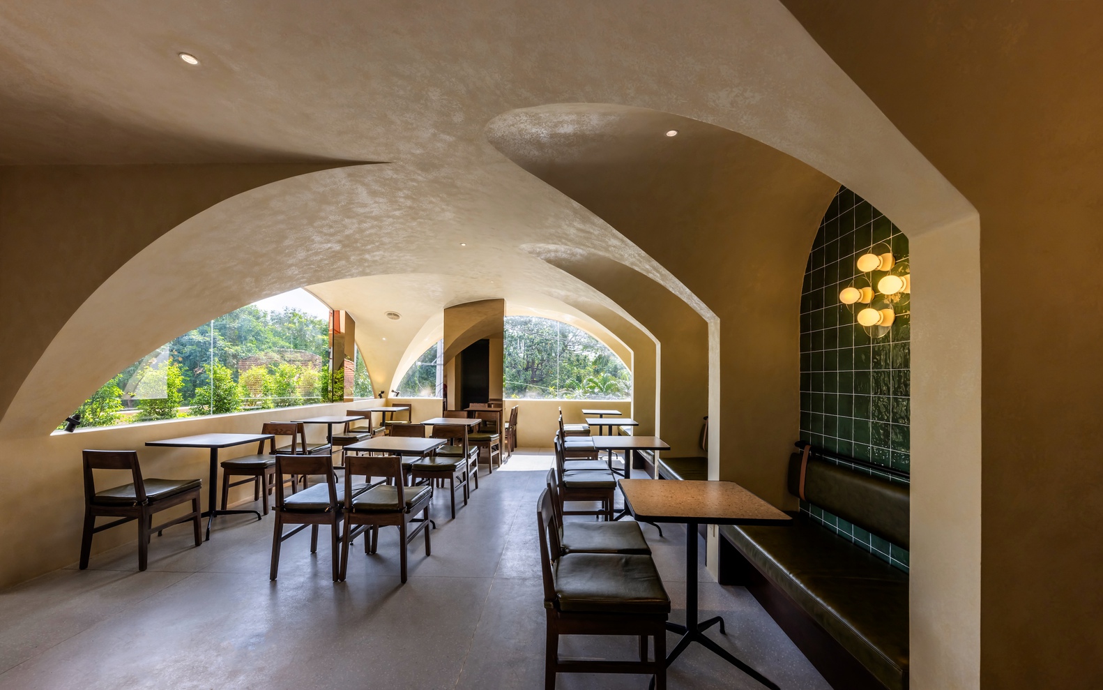 Thiết kế nội thất hài hòa giữa truyền thống và hiện đại thông qua việc sử dụng các vật liệu tự nhiên như gỗ, đá mài, bê tông thô và gạch men thủ công, tạo nên cảm giác giản dị và gần gũi. Gương và kính được bố trí khéo léo để tăng cường trải nghiệm không gian và che khuất các cột kết cấu hiện có, tạo nên một không gian nội thất mở và mạch lạc.
