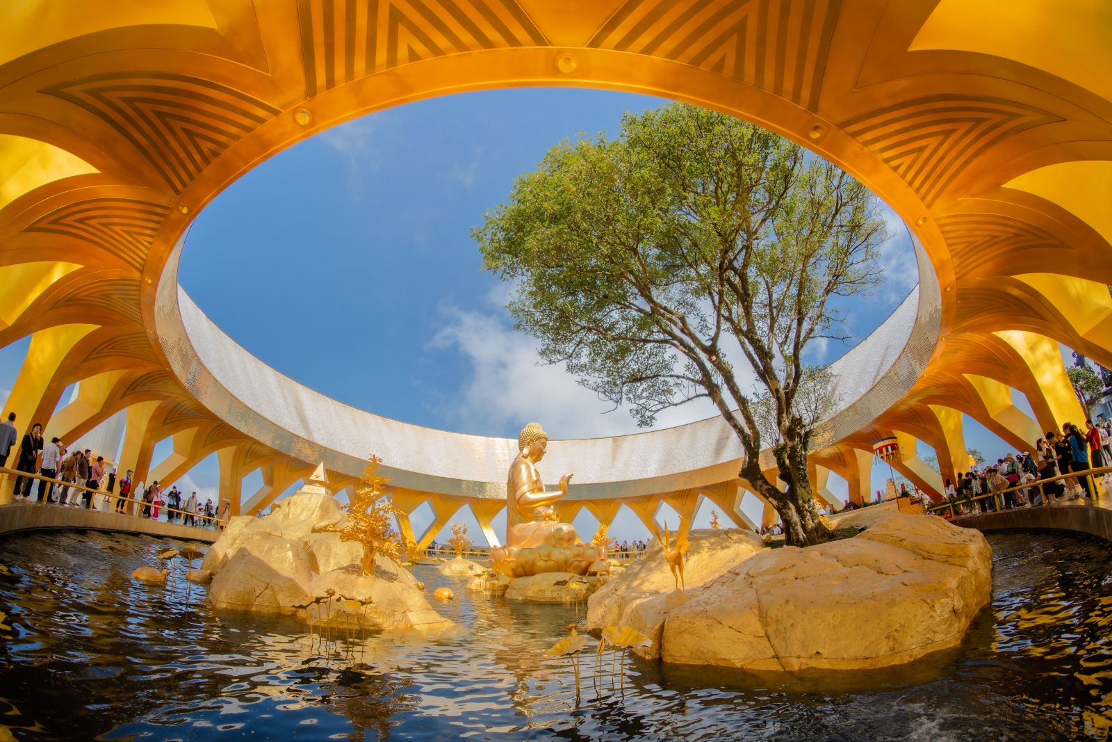 Nằm tại vị trí cao nhất trên đỉnh núi Bà Đen, tôn tượng Đức Phật Câu Na Hàm Mâu Ni được tạo tác trong sắc vàng hoàng kim rực rỡ. Với dáng ngồi kiết già (hay còn gọi là liên hoa tọa) trên đài sen đặt giữa hồ Ưu đàm, Tôn tượng Phật Câu Na Hàm mang khuôn mặt từ bi, đôi mắt mở dịu nhìn xuống, thể hiện sự tĩnh lặng, thấu hiểu và lòng thương xót chúng sinh.