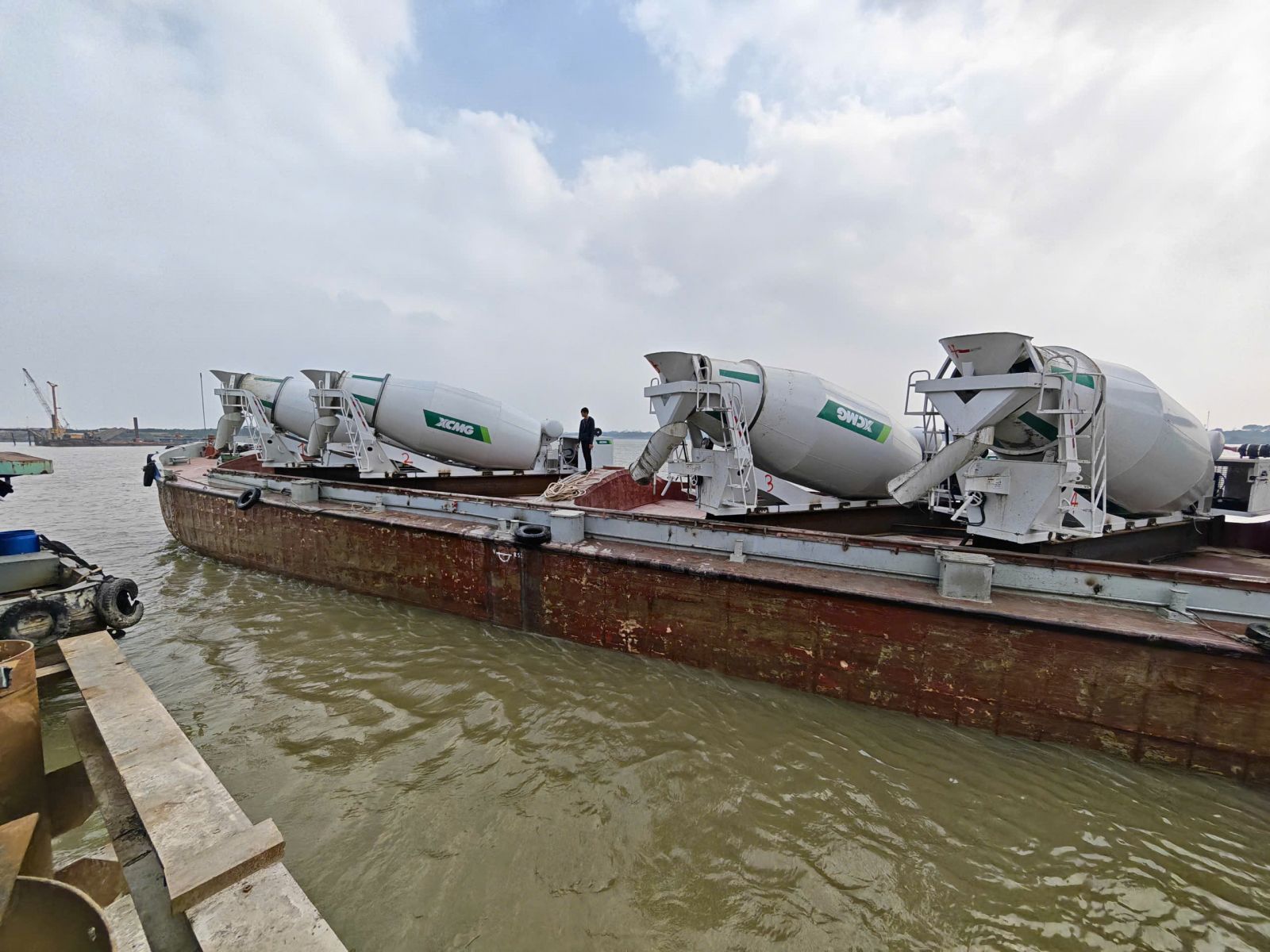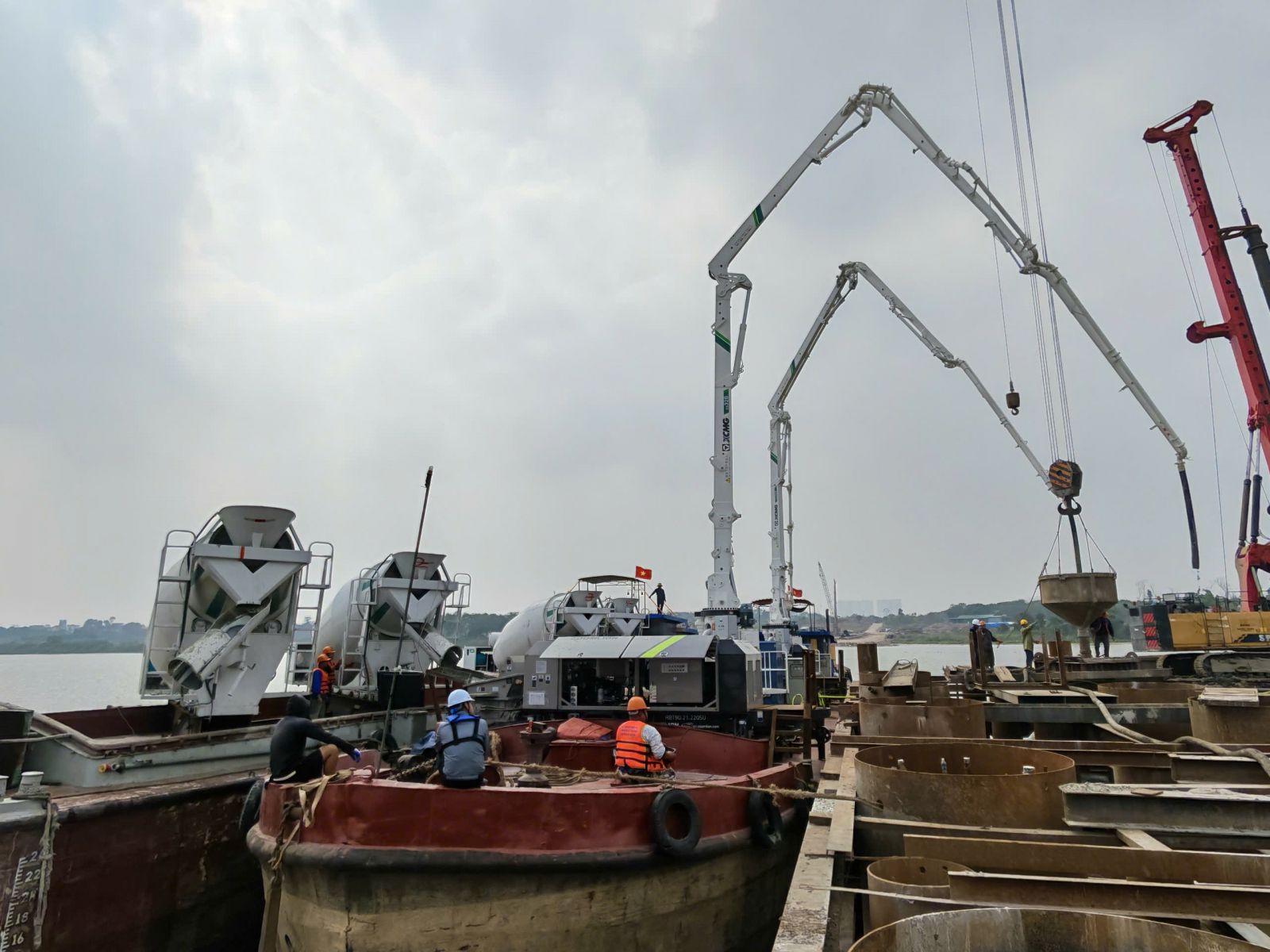 Hàng loạt máy trộn bê tông được trang bị đồng bộ trên sà lan trên sông, phục vụ công tác đổ bê tông trụ cầu.