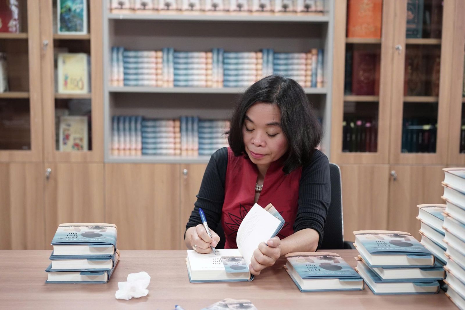 Tác giả Nguyễn Phan Quế Mai giao lưu với độc giả tại sự kiện ra mắt sách tại Hà Nội.