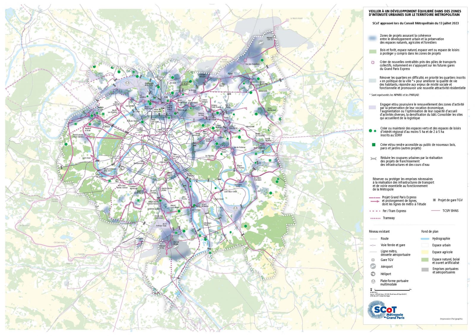 Sơ đồ liên kết lãnh thổ (SCOT) được lập ra ở quy mô Đại đô thị Paris với mục đích để làm khung tham chiếu, cùng định ra những tiêu chí hoạch định đồng bộ trong các bản PLU cho toàn vùng đại đô thị. Như cái tên của nó, công cụ này chú trọng đảm bảo liên kết chặt chẽ, cùng phát triển hài hòa giữa các thành phố Paris và phụ cận, để cùng chia sẻ hạ tầng giao thông công cộng liên vùng, cùng bảo vệ mạng lưới sinh thái và cân đối mật độ dân cư. Vùng đô thị Paris đã thông qua bản quy hoạch tổng thể SCOT vào ngày 13/7/2023 để thống nhất các định hướng chung. Điều này đã dẫn đến những điều chỉnh sửa đổi PLU - lúc đó được xem xét để tập trung mạnh vào khí hậu, không gian xanh và di sản. PLU của Paris trước đó có từ năm 2006. Một cuộc sửa đổi toàn diện đã được bắt đầu vào năm 2021, và hoàn thành 3 năm sau, vào 2024.