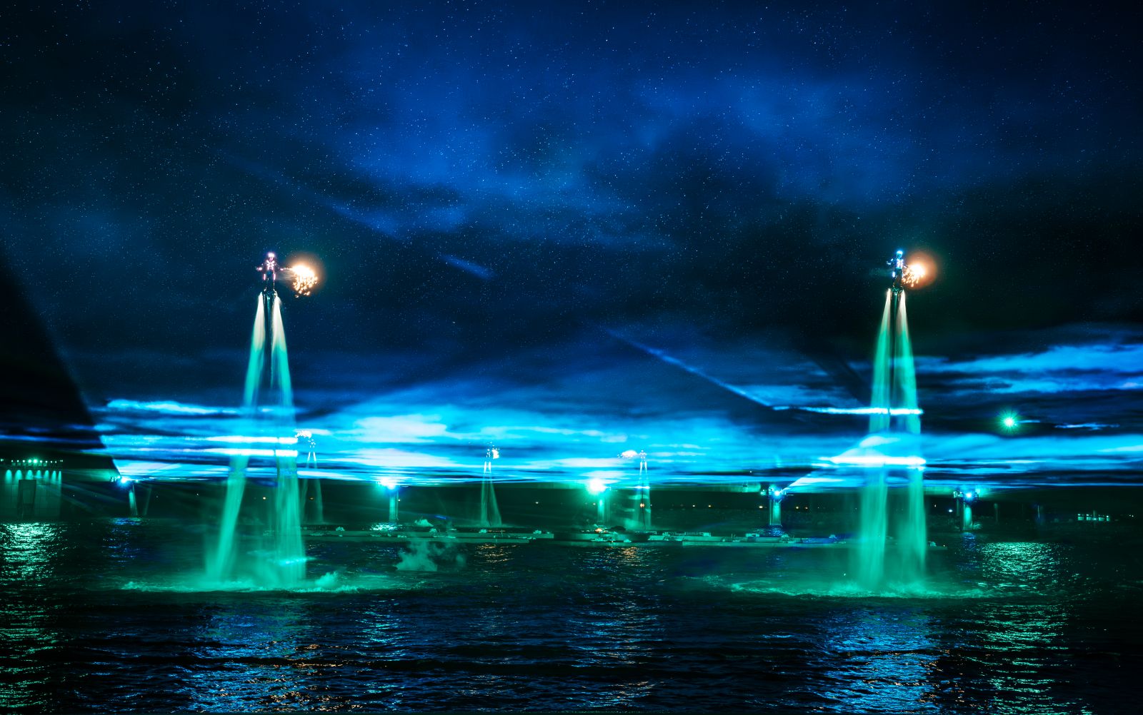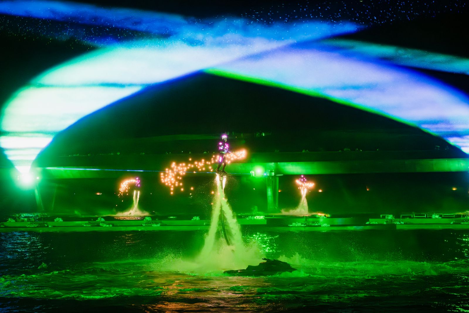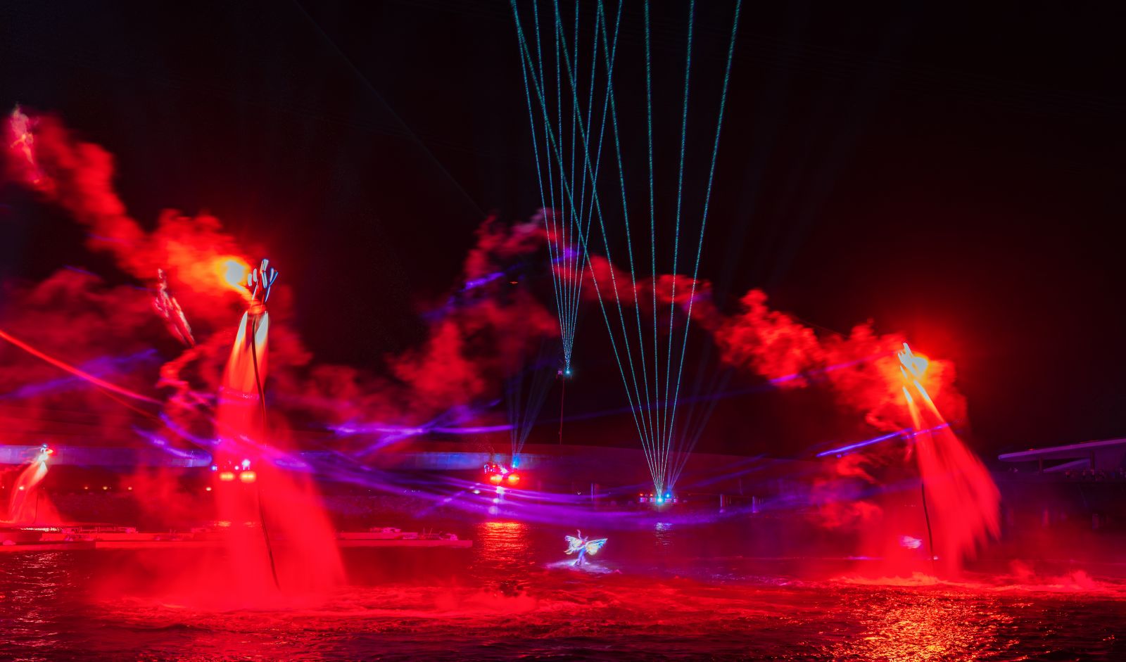 Đồng thời, toàn bộ không gian được “phù phép” bởi Laservision, thương hiệu trình diễn ánh sáng hàng đầu thế giới. Hàng trăm tia laser công suất lớn quét dọc theo mặt biển hòa cùng màn nước, khói và ánh sáng LED tạo ra hiệu ứng ba chiều sống động, khiến người xem có cảm giác như đang lạc vào giữa một vũ trụ ánh sáng khổng lồ.