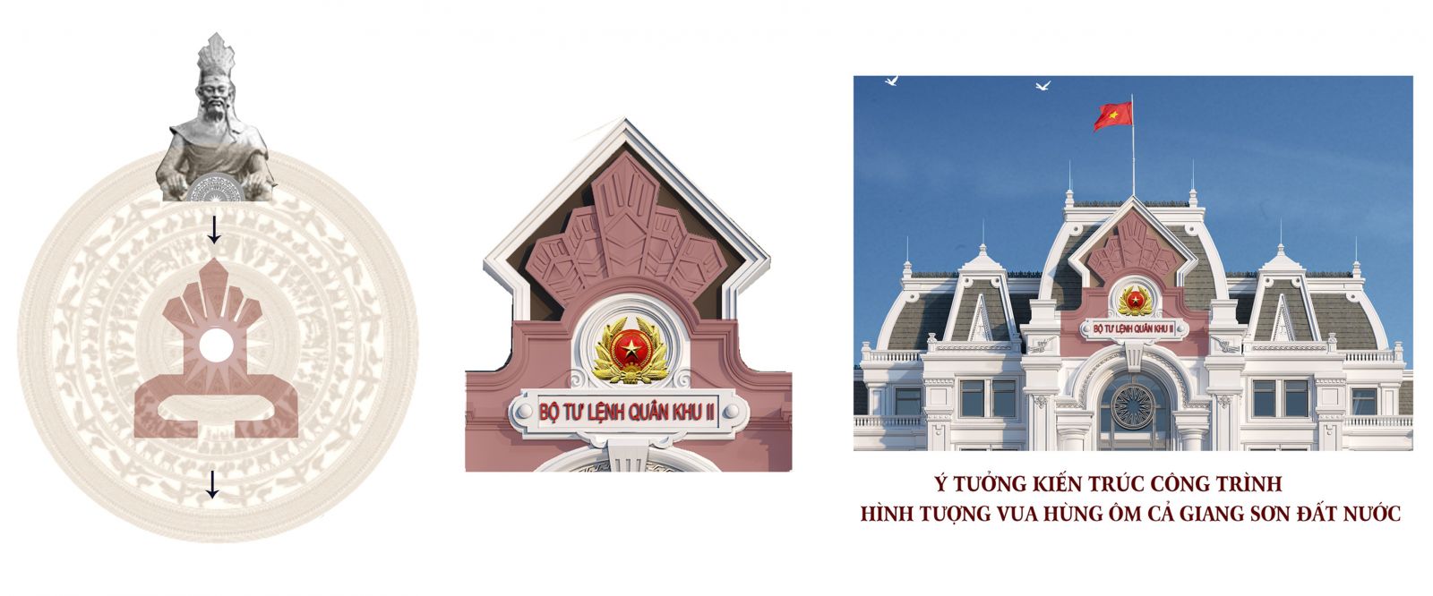Khi được giao nhiệm vụ thiết kế Sở chỉ huy quân khu 2, một công trình hết sức quan trọng của hệ thống sở chỉ huy quốc phòng an ninh trong nhiệm vụ xây dựng lực lượng bảo vệ tổ quốc, đặt tại thành phố Việt Trì, Phú Thọ - quê hương đất tổ của 18 đời Vua Hùng linh thiêng nguồn cội, tôi đã suy nghĩ việc đưa chất liệu văn hoá nào vào từ ý tưởng đến công năng, chi tiết của công trình kiến trúc? Và đó chắc chắn sẽ là trống đồng thời Hùng Vương thuộc văn hóa Đông Sơn. Biểu tượng đỉnh cao của nền văn minh sông Hồng, của văn hóa nghệ thuật Việt Nam. Bởi vậy, việc nghiên cứu hoa văn họa tiết của trống đồng để vận dụng một cách sáng tạo và cách điệu nghệ thuật đưa vào trong kiến trúc tổng thể và chi tiết cũng như tổ hợp các không gian khác nhau như tiền sảnh, đại sảnh, phòng khánh tiết, phòng khách quốc gia - quốc tế được tôi chú trọng, chọn lọc cân nhắc rất kỹ lưỡng.