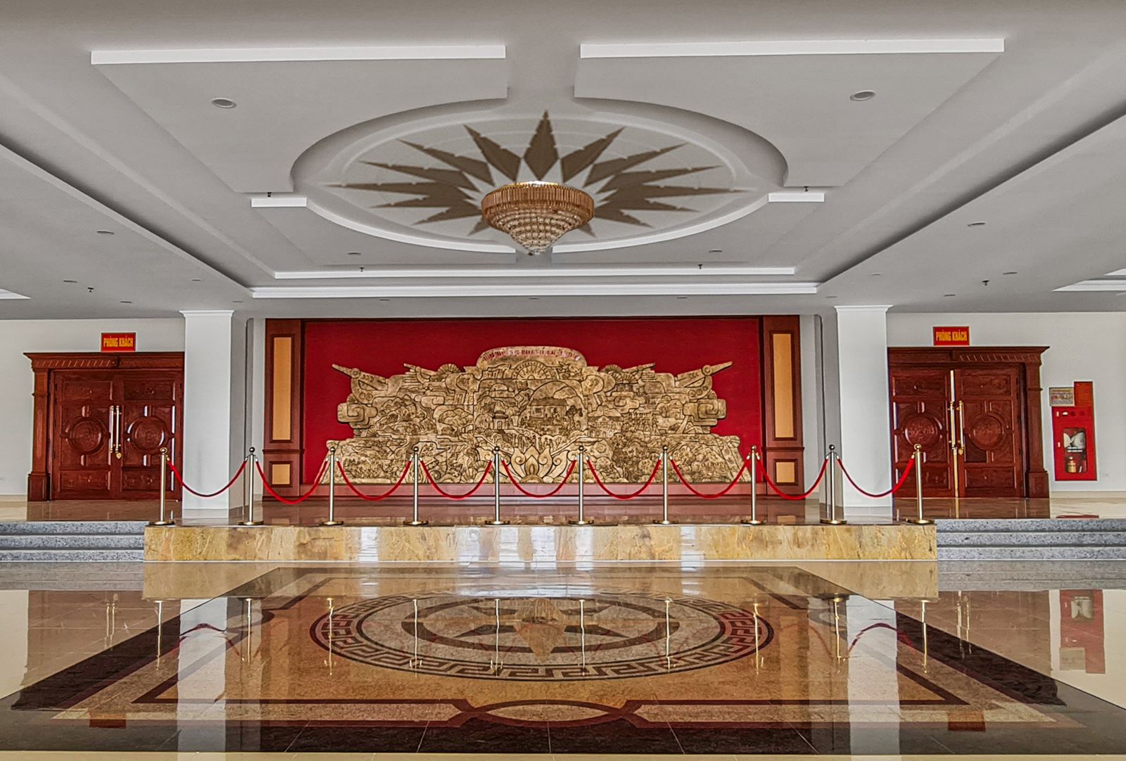 Bước vào đại sảnh không gian cũng rất ấn tượng chiều cao thông 2 tầng được nghiên cứu tổng thể với triết lý trời tròn đất vuông, tứ trụ vững bền muôn thuở. Tại vị trí trang trọng trong phòng khánh tiết là tác phẩm phù điêu gò đồng trên nền đỏ sẫm nổi bật Bác hồ với chiến sĩ Sư đoàn 308 - Đại đoàn quân Tiên Phong.