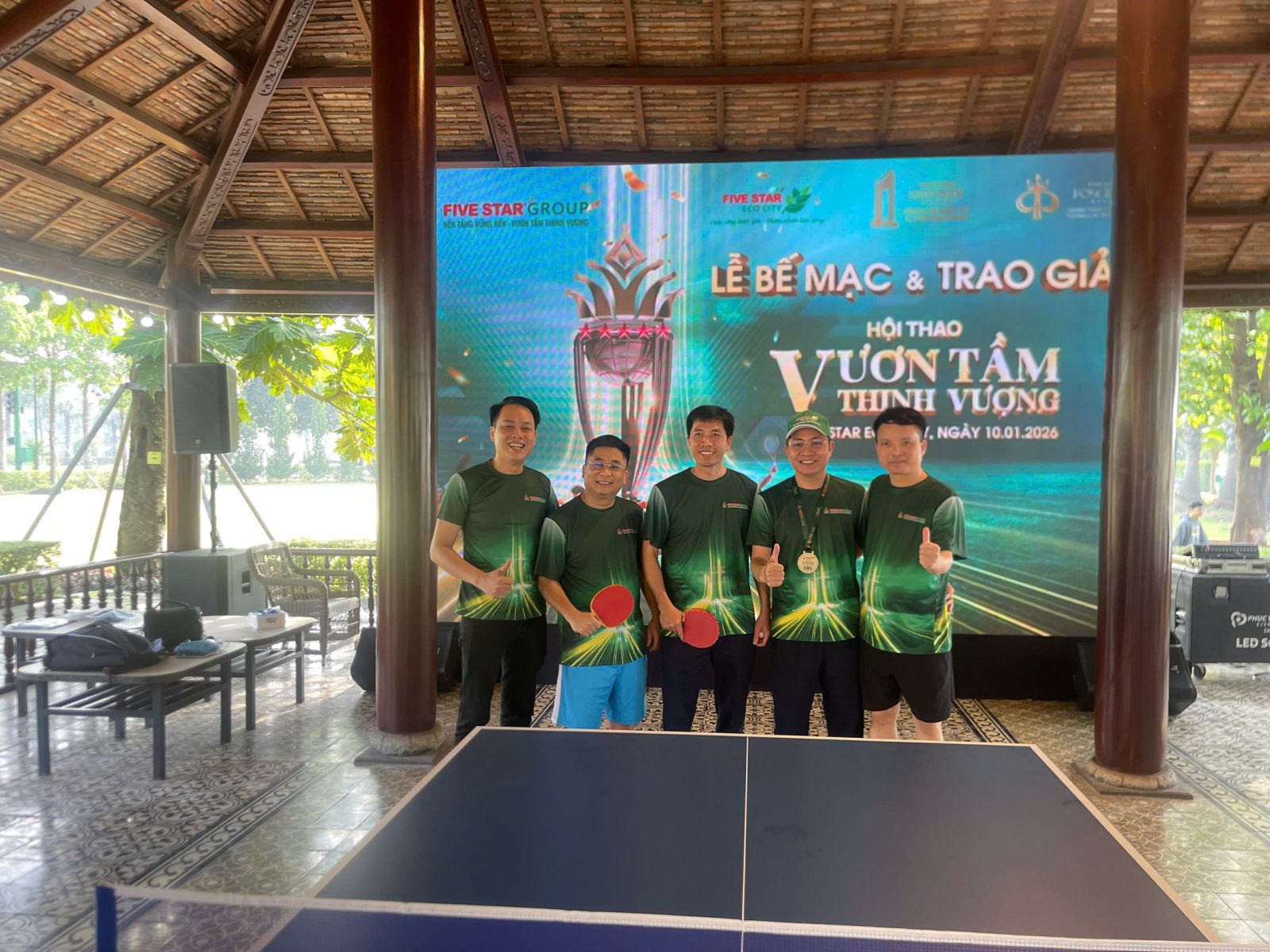 Các vận động viên bóng bàn vào chung kết chụp ảnh lưu niệm trước giờ thi đấu tại Hội thao Truyền thống Five Star 2026.