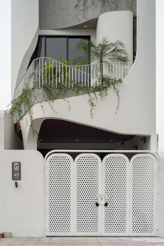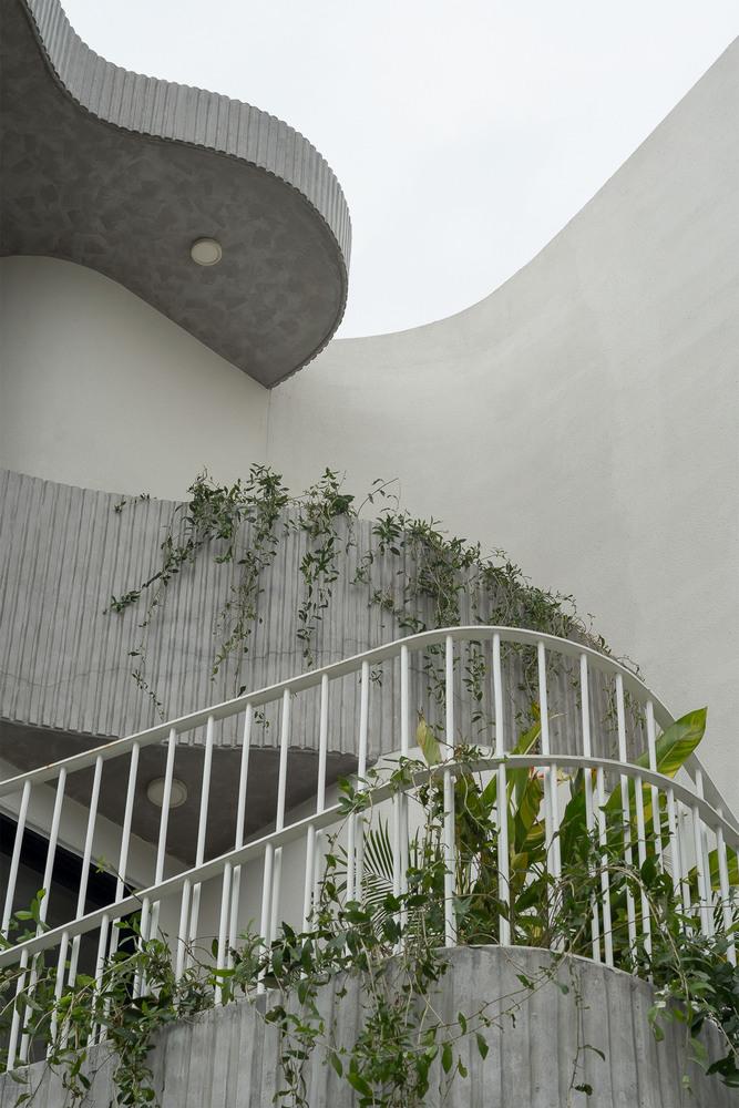 Ngôn ngữ đường cong và trải nghiệm không gian – Các hình dạng cong được áp dụng nhất quán trên lan can, mái vòm, bề mặt tường, trần nhà và mặt tiền để làm mềm các cạnh sắc nhọn và tạo nên một ngôn ngữ kiến trúc mạch lạc. Bên cạnh những cân nhắc về an toàn, những đường cong này ảnh hưởng trực tiếp đến cách người sử dụng di chuyển và tương tác với không gian. Các bề mặt bo tròn cho phép luồng di chuyển diễn ra suôn sẻ, giảm thiểu những thay đổi hướng đột ngột và giúp người dùng cảm nhận trực quan ranh giới giữa các khu chức năng. Về mặt thị giác, các đường cong làm mềm sự chuyển tiếp giữa các không gian, giảm bớt cảm giác phân mảnh thường thấy trong các ngôi nhà phố. Bằng cách bo tròn các góc, ánh sáng và tầm nhìn được dẫn sâu hơn vào bên trong, tăng cường cảm giác rộng rãi và thoải mái.