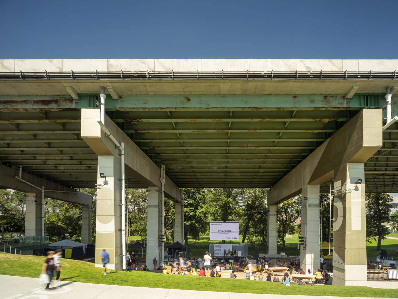 Tương tự, The Bentway ở Toronto đã biến đổi khu đất chưa được sử dụng bên dưới Đường cao tốc Gardiner thành một không gian công cộng sôi động, với kế hoạch mở rộng sáng kiến này trên nhiều đoạn đường cao tốc hơn. Dự án này, được tài trợ bởi sự kết hợp giữa đầu tư công và đóng góp tư nhân, đã tạo ra một khu vực thân thiện với người đi bộ và người đi xe đạp, cung cấp các chương trình quanh năm và không gian cho các sự kiện văn hóa. Trong cả hai trường hợp, khu vực tư nhân đều được hưởng lợi từ các cơ hội bán lẻ và thương mại liên quan, trong khi công chúng được hưởng lợi từ cơ sở hạ tầng đô thị và tiện ích công cộng được cải thiện.