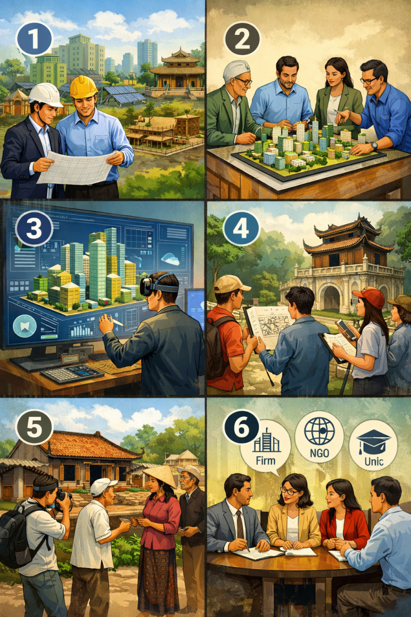 Định hướng mới cần nhấn mạnh việc xây dựng các chương trình đào tạo song bằng, đồng hướng dẫn, đồng nghiên cứu, trong đó sinh viên và giảng viên Việt Nam được tiếp cận chuẩn mực quốc tế, nhưng đồng thời phải đào sâu các vấn đề bản địa như kiến trúc nhiệt đới, di sản, làng xã, đô thị chuyển đổi, nhà ở cho nhóm yếu thế. Đây chính là không gian để Việt Nam đóng góp giá trị riêng vào mạng lưới tri thức kiến trúc toàn cầu.