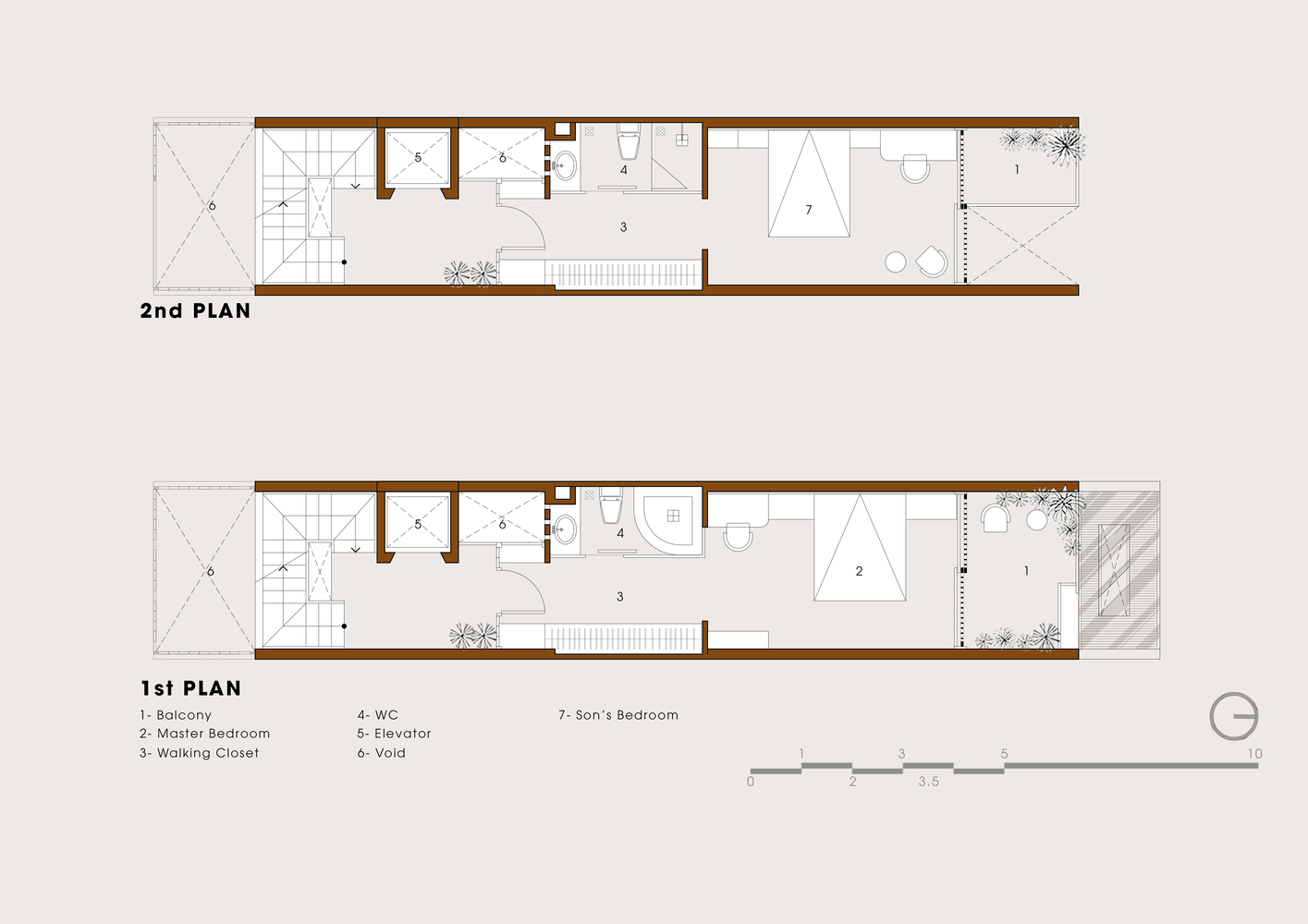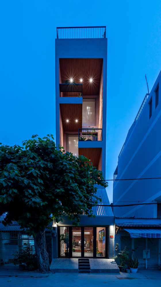 Tầng 1 của ngôi nhà có đủ chỗ để ô tô và xe máy. Phòng khách kết hợp với khu thờ cúng; khu thờ phía trên là giếng trời để đảm bảo sự tôn nghiêm. Cầu thang và thang máy được bố trí ở cuối nhà để tạo cho mỗi tầng diện tích sử dụng lớn nhất có thể. Phòng bếp và phòng ăn được đưa lên gác lửng. Tầng lửng có giếng trời nhìn xuống khu vực gara và sảnh vào nên bạn có thể vừa nấu ăn vừa trông nhà. Tầng 2, 3, 4 mỗi tầng có 1 phòng ngủ có nhà vệ sinh riêng; Phòng tắm được thiết kế vách kính giúp giảm diện tích chiếm dụng tường, tất cả các phòng ngủ đều có ban công rộng tạo không gian xanh có thể dùng làm nơi thư giãn, các ban công được khoét rỗng ở mỗi tầng với các vị trí khác nhau, tạo sự thú vị cho mặt tiền và còn là nơi giao tiếp giữa các tầng. Sân thượng được trang bị khu vực giặt là và hồ bơi nhỏ với tầm nhìn ra trung tâm thành phố.