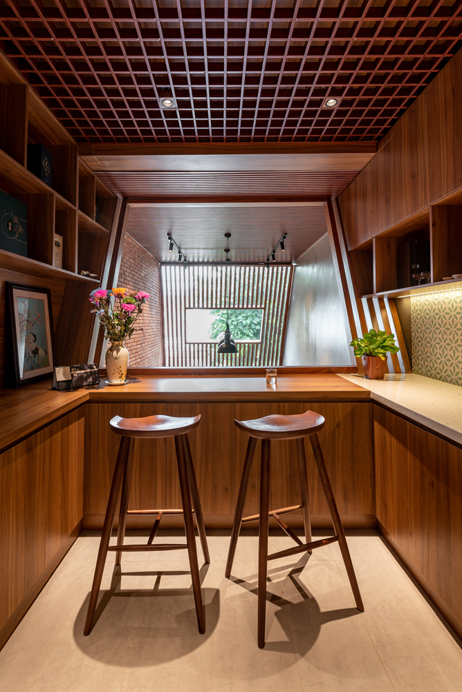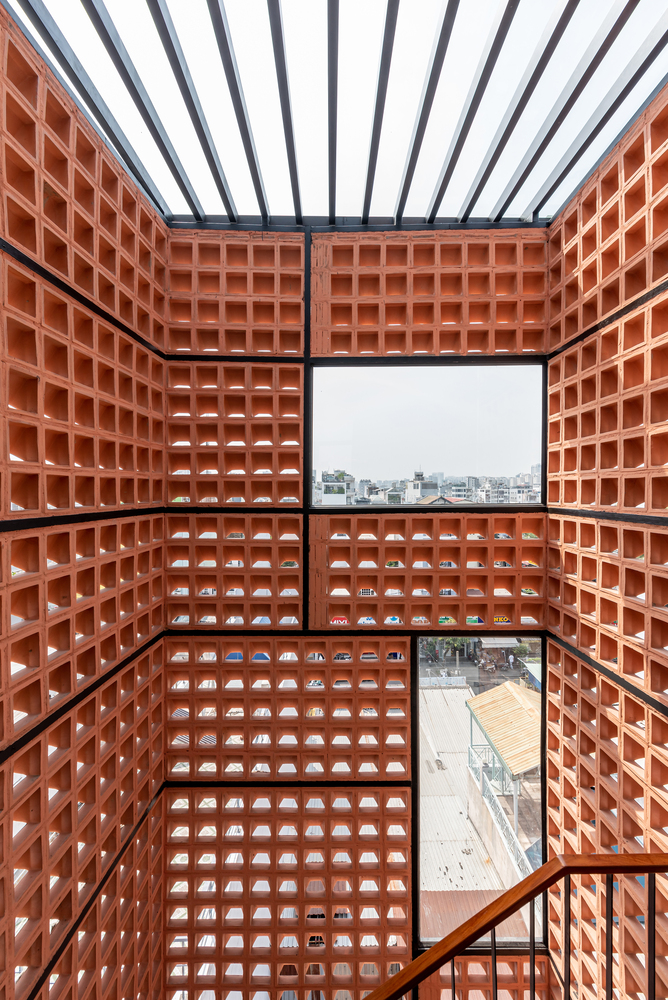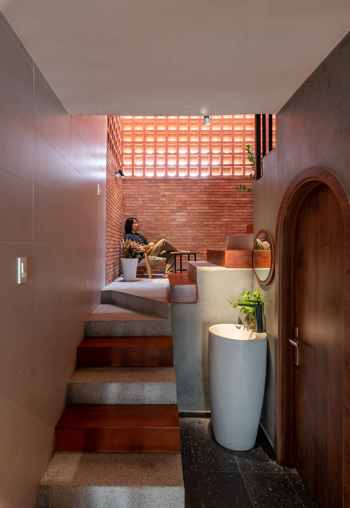 Mặt sau cầu thang được ốp gạch bông gió, loại ngói phổ biến ở địa phương, tạo sự thông thoáng đối lưu nhưng không bị mưa tạt, đồng thời kết hợp các tấm kính để lấy sáng tạo cửa sổ nhìn lên trời. Chúa. Các bức tường mặt tiền của giếng trời được ốp bằng gạch cổ, là gạch từ những ngôi nhà cổ. Sau khi dỡ bỏ các bức tường, những viên gạch còn nguyên vẹn sẽ được cắt thành ba lát mỏng rồi ốp gạch lại trong ngôi nhà mới. Các bức tường còn lại được sơn xi măng màu xám, ốp gỗ tối màu tạo cảm giác mộc mạc và giàu cảm xúc. Sàn nhà và các vật dụng nội thất cũng sử dụng gam màu vân gỗ mộc mạc tạo cảm giác ấm áp, thân mật cho ngôi nhà.