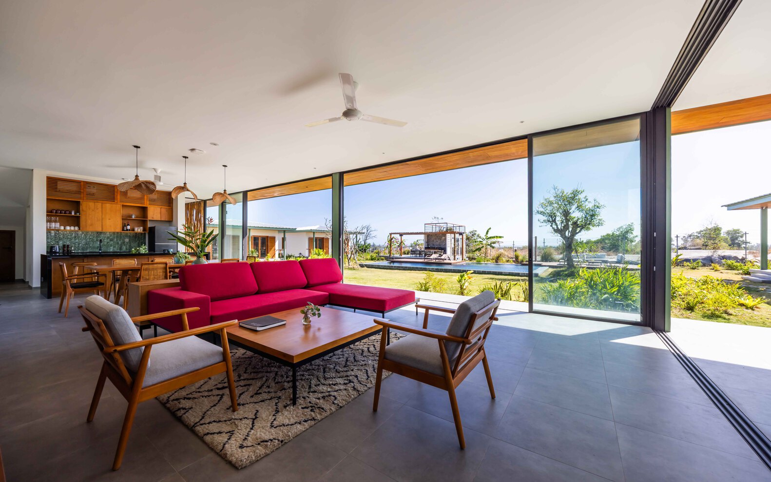 Dự án bao gồm một biệt thự chính hai tầng cùng với ba ngôi nhà nhỏ độc lập được bố trí rải rác trong khu vườn. Ngôi nhà chính tập trung các chức năng sinh hoạt chung của khu dân cư, trong khi các công trình nhỏ hơn cung cấp chỗ ở linh hoạt cho bạn bè và người thân. Cùng nhau, các công trình bao quanh khu vườn trung tâm và hồ bơi, tạo nên trái tim sinh hoạt của khu nghỉ dưỡng.