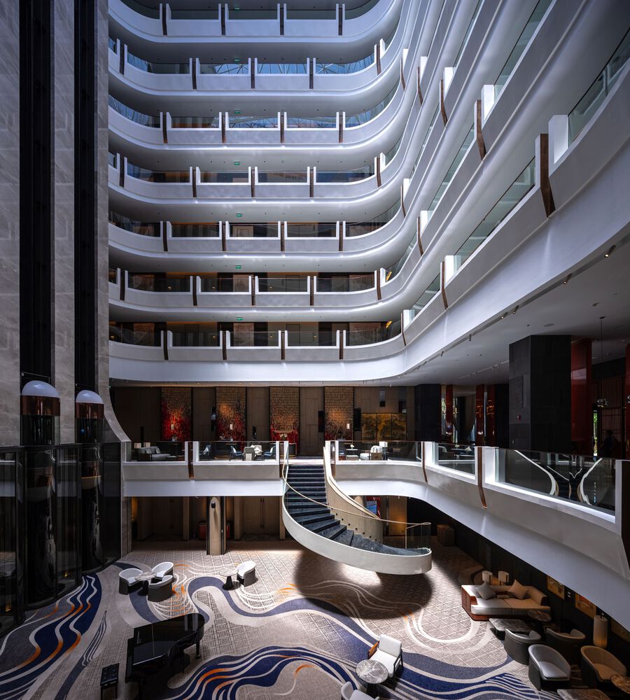 Không gian công cộng theo chiều dọc này biến khách sạn thành một môi trường nhiều tầng, tương tự như một ngôi làng thẳng đứng. Các chức năng chính - bao gồm nhà hàng, phòng khiêu vũ, không gian hội họp, tiện nghi chăm sóc sức khỏe và quán bar trên tầng thượng - được bố trí tuần tự xung quanh giếng trời, khuyến khích sự khám phá và định vị khách sạn như một điểm đến độc lập. Giếng trời được tô điểm bởi ba thang máy đưa đón bằng kính, tạo nên điểm nhấn thị giác năng động và nâng cao trải nghiệm di chuyển theo chiều dọc. Không giống như cách bố trí khách sạn theo chiều ngang truyền thống, cấu hình thẳng đứng mở này thúc đẩy sự tương tác, khám phá và tạo nên bản sắc không gian mạnh mẽ.