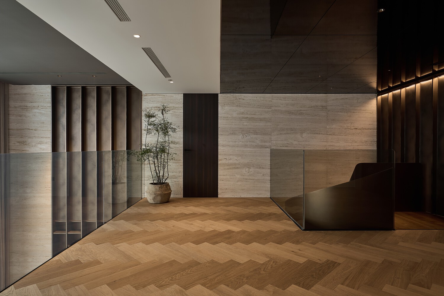 Một trục giao thông trung tâm định hình bố cục, chia căn penthouse thành hai phần: các khu chức năng chính ở một bên và các khu vực bổ sung ở phía còn lại với tầm nhìn bao quát thành phố. Ở cả hai đầu, một cầu thang thẳng và một cầu thang xoắn ốc mang tính điêu khắc kết nối hai tầng, cho phép di chuyển thông suốt khắp căn hộ.