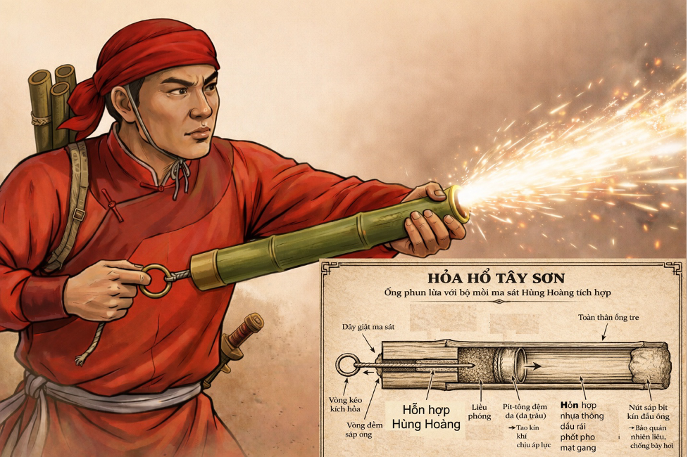 Theo sử sách nhà Thanh, Đại Việt thời hoàng đế Quang Trung có loại ống phóng hỏa hổ Phốt pho bằng tre (có thể là dùng một lần), được trang bị đại trà, tốc độ bắn tức thì nên nhanh hơn kiếm địch, bắn luồng lửa phốt pho với mạt gang xa đến 10 m, ngay lập tức gây mù mắt địch, biến kẻ thù thành bó đuốc sống, xuyên thủng mũ sắt, giáp sắt nhờ nhiệt độ cao, một hàng quân ta đồng loạt phóng hỏa hổ có thể gây ngạt thở tức thì cho hàng lính địch. Ảnh: NVCC.