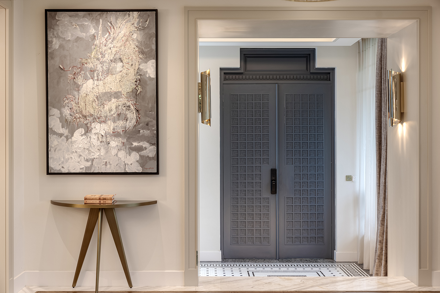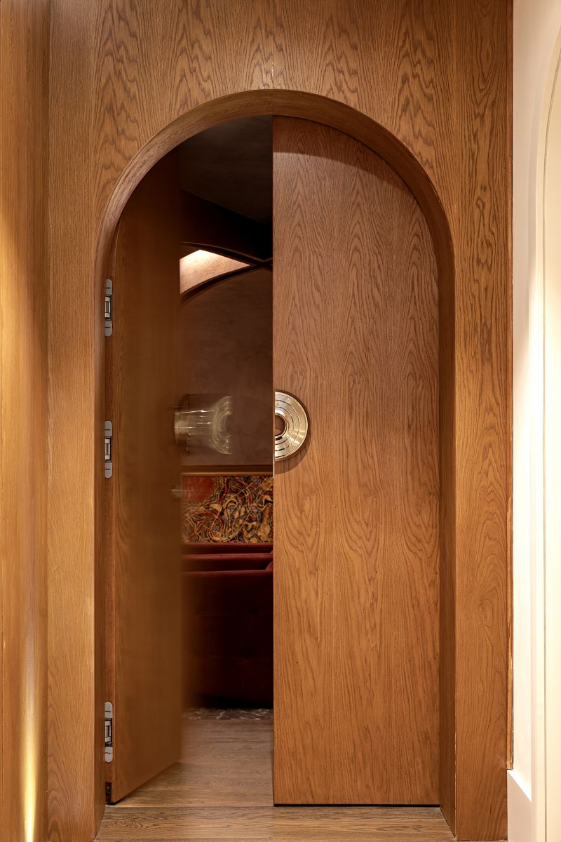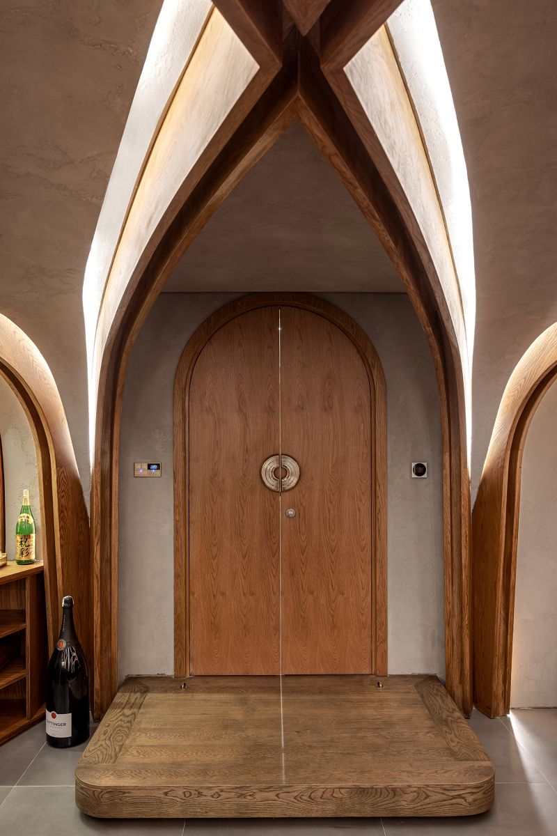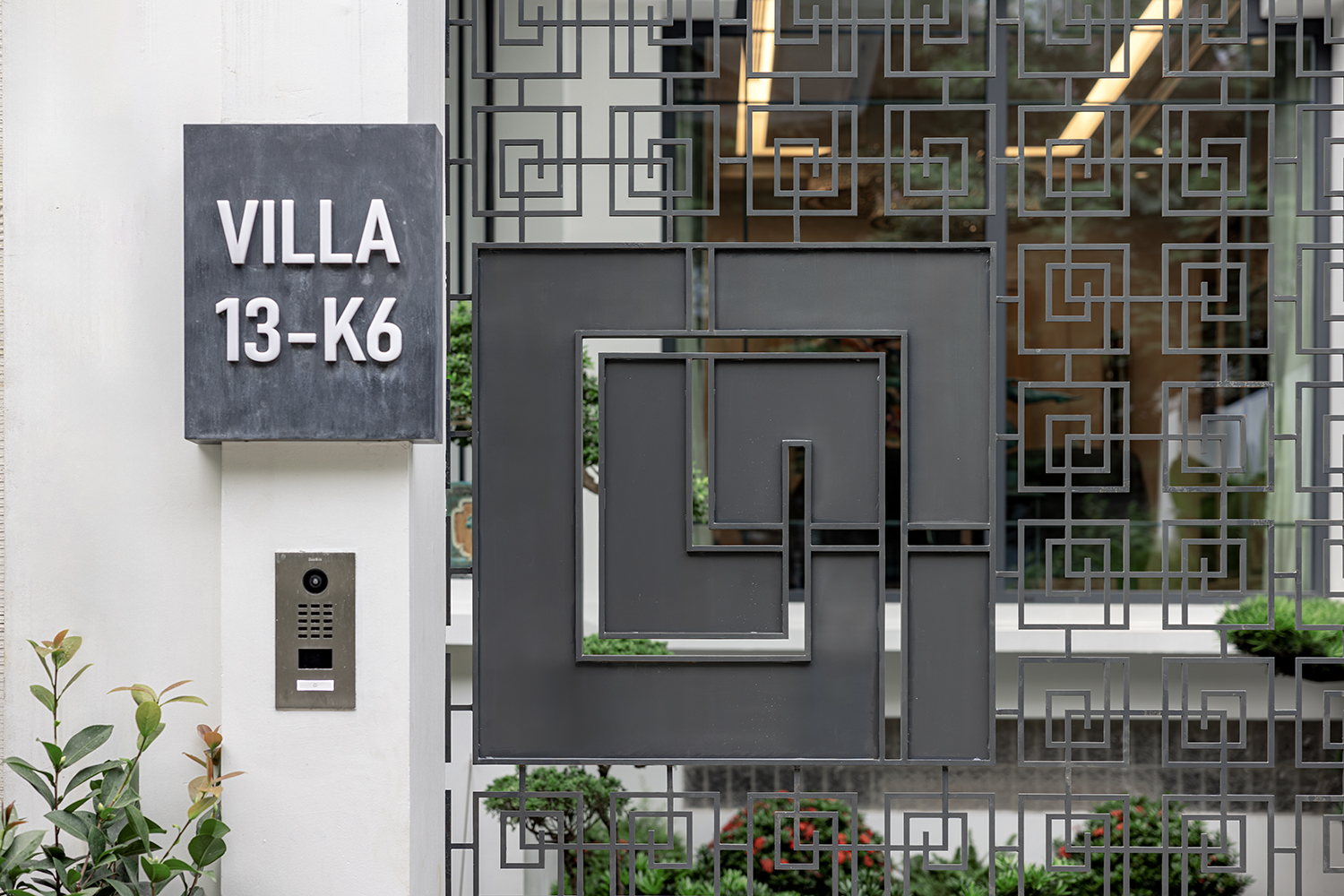 Biểu tượng này không được sử dụng một cách khiên cưỡng mà xuất hiện như những "điểm chạm" đầy chủ ý tại các không gian chuyển tiếp. Ngay từ ngưỡng cửa đầu tiên, logo xuất hiện với tỷ lệ lớn, cách điệu thành hệ hoa thép tinh xảo trên cổng chính, định danh cho công trình ngay từ mặt lộ. Tiến vào bên trong, sự hiện diện ấy trở nên ý nhị hơn khi được chuyển hóa thành họa tiết chạm khắc trên cửa chính, và kết thúc hành trình tại sảnh đón bằng một bức tranh mosaic ghép tay thủ công tỉ mỉ dưới sàn. Sự xuất hiện có nhịp độ này tạo nên một cảm giác thuộc về đầy tự hào, biến ngôi nhà thành một thực thể duy nhất, không thể trộn lẫn.