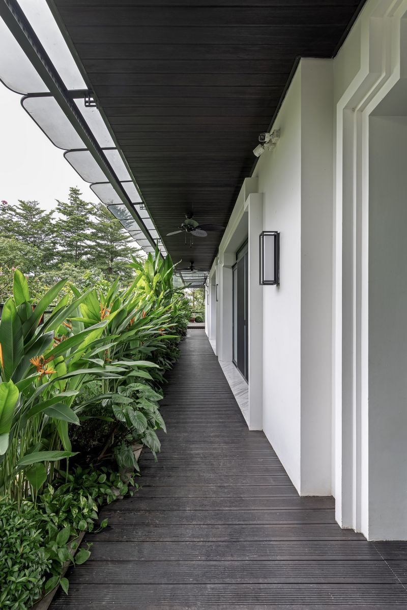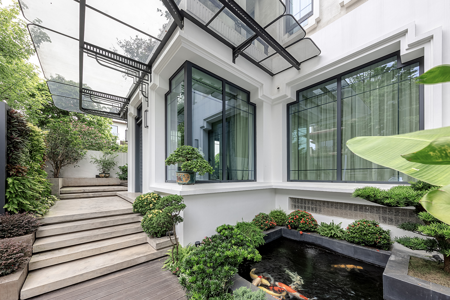 Tại L Villa, sự sang trọng không nằm ở những chi tiết trang trí cầu kỳ mà hiện diện trong sự thấu hiểu về tỷ lệ và cảm xúc không gian. Ngay tại lối vào, một hồ cá Koi chạy dọc mặt tiền đóng vai trò như một "lớp đệm" thanh lọc bụi bẩn và tiếng ồn, tạo ra một khoảng lặng thư thái trước khi bước vào không gian sống.