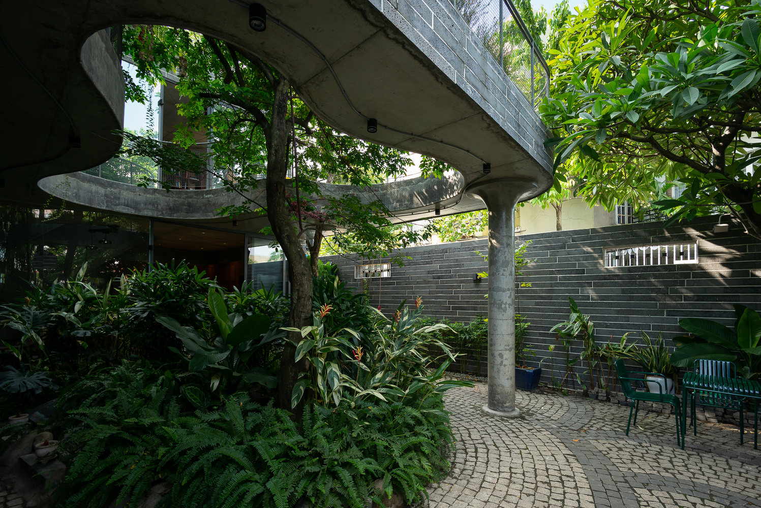 Tối ưu hóa diện tích hạn chế: Khu đất có chiều sâu hạn chế, mỗi sàn khoảng 40m2, nhưng khoảng lùi quy hoạch lại lớn - điều này làm tăng thách thức về diện tích sử dụng. Để tránh cảm giác chật chội và tăng cường thông gió, các bức tường đặc được giảm thiểu. Thay vào đó, các khối gỗ tạo nên không gian riêng tư, trong khi các tấm kính lớn được sử dụng để mở ra tầm nhìn hướng ra khu vườn và đón ánh sáng tự nhiên vào ban ngày. Sự thô ráp của vật liệu (đá núi lửa, đá mài, xi măng đánh bóng, v.v.), kết hợp với tông màu trầm chủ đạo, tạo nên sự mát mẻ, đồng thời tăng thêm vẻ sang trọng cho công trình.
