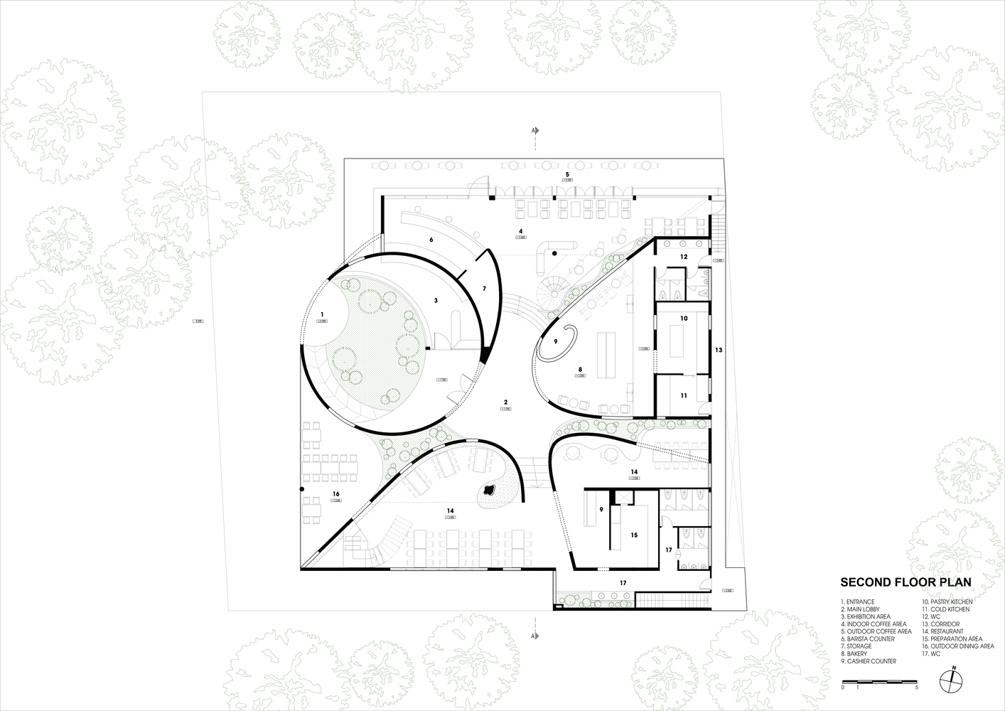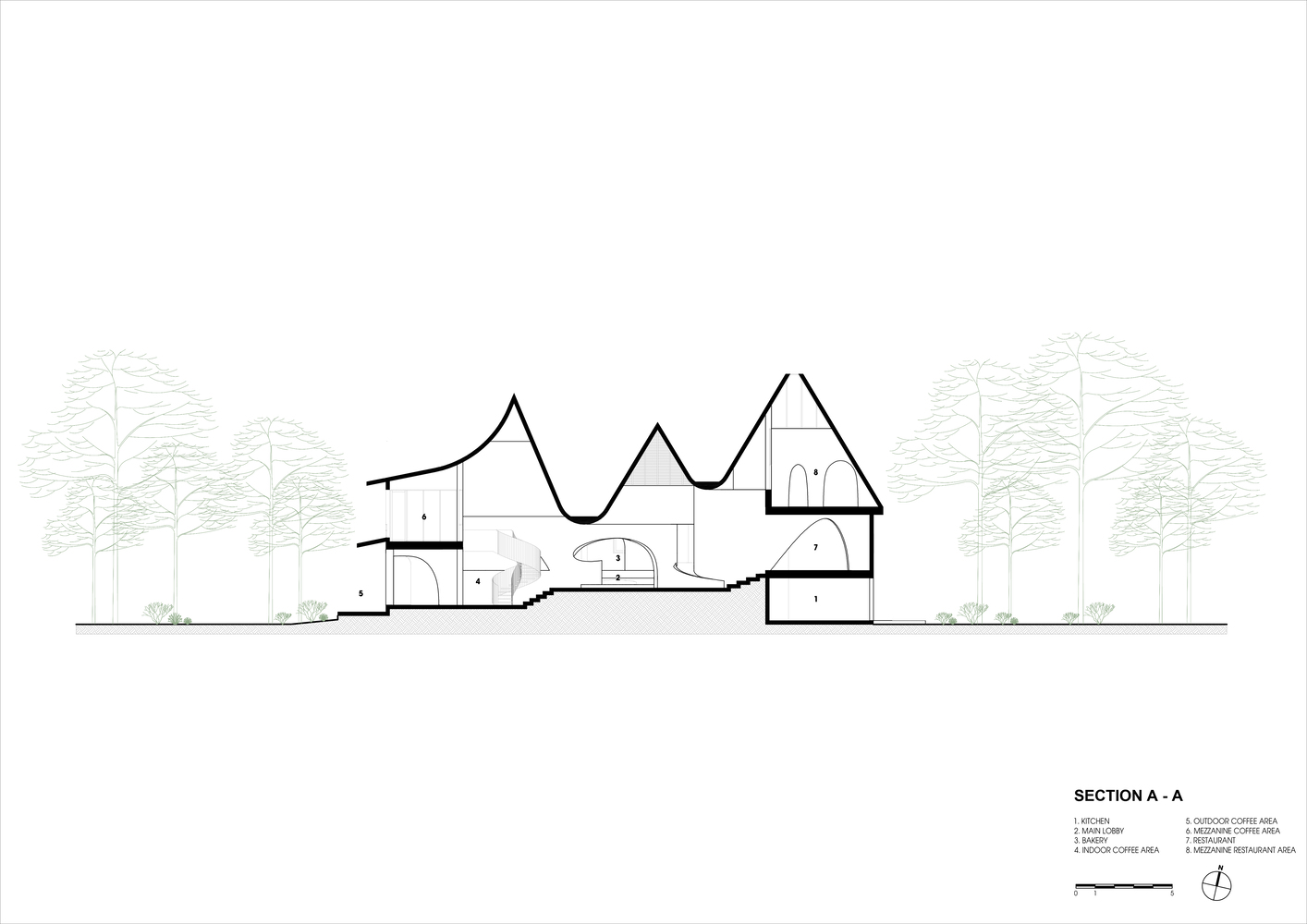 Bên dưới mái vòm thống nhất này, các bức tường được sắp xếp với cảm giác tự do và uyển chuyển, tách biệt khỏi mái nhà để những tia nắng ban ngày và làn gió tự nhiên len lỏi qua những khoảng hở được thiết kế khéo léo. Tất cả các khu vực chức năng được phân tán nhưng vẫn được kết nối với nhau bởi mái nhà bao quát, tạo nên một trải nghiệm không gian gắn kết. Lối vào chính xuyên qua một khoảng sân tròn ngoài trời, tạo nên một ngưỡng cửa nhẹ nhàng giữa không gian bên ngoài và bên trong. Từ đây, các không gian dần dần đổ xuống rừng thông, những thay đổi tinh tế về độ cao tạo nên sự gần gũi và tương tác. Sự chuyển động qua các lớp này hé lộ một chuỗi các yếu tố được dàn dựng tỉ mỉ, bao gồm sự thoáng đãng và khép kín, ánh sáng và bóng tối - đóng khung thiên nhiên trong những góc nhìn được chọn lọc kỹ lưỡng thay vì phơi bày tất cả cùng một lúc.