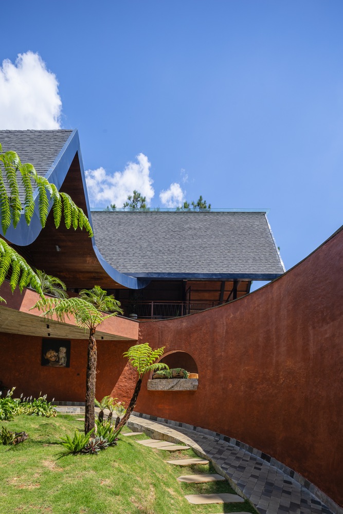 Vật liệu càng củng cố cuộc đối thoại này với không gian. Những bức tường xây trát vữa được hoàn thiện với tông màu đỏ thẫm gợi lên hình ảnh đất bazan đặc trưng của vùng đất này, trong khi trần bê tông vẫn giữ được dấu ấn của ván khuôn gỗ thông. Sàn nhà thể hiện sự phân cấp không gian: gạch đất nung tỏa ra từ sảnh trung tâm, các lối đi kết nối sử dụng đá mài, và các khu vực phụ được ốp đá tự nhiên không đồng đều. Những biến tấu xúc giác này khơi gợi sự tương tác vượt ra ngoài phạm vi thị giác, kích hoạt nhiều giác quan.