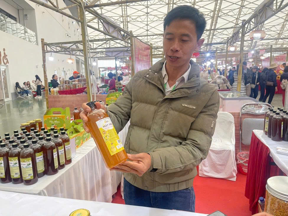 Ông Đoàn Đình Khính – Giám đốc Công ty TNHH Mật ong Vân Hồ đang giới thiệu sản phẩm (Ảnh: Đinh Long).