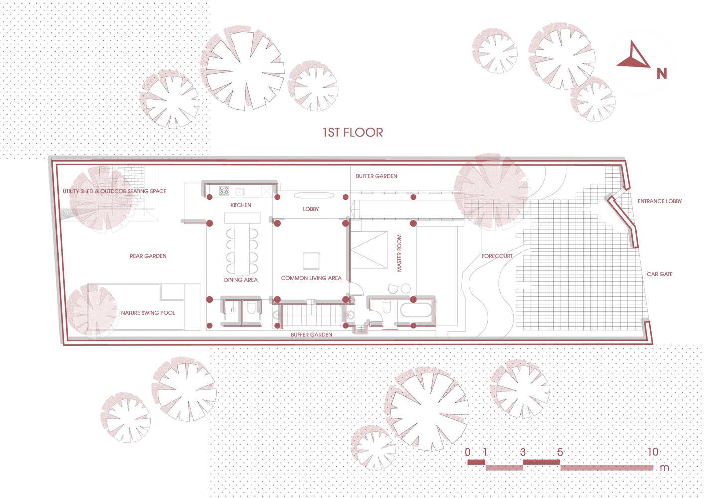 Yếu tố Kim trong kiến trúc đương đại là kết cấu thép, mái tôn và các vật liệu kim loại khác. Đây là thành phần không thể thiếu trong kiến trúc hiện đại, giúp tăng tính bền vững và tuổi thọ cho công trình và nội thất. Tác giả đã khéo léo sử dụng sơn màu tự nhiên cho mái tôn khổ lớn và tôn cán nguội hai lớp để đảm bảo yêu cầu thẩm mỹ, tiết kiệm năng lượng và tối ưu chi phí. Khả năng truyền âm của mái tôn giúp không gian trong nhà hòa quyện với thiên nhiên hơn, đặc biệt là ở những không gian yên tĩnh như Đoài, nơi người sử dụng cảm thấy dễ chịu hơn với tiếng mưa, tiếng gió và tiếng côn trùng. Kim mang năng lượng Trung hòa, là sự chuyển tiếp, kết hợp hài hòa với các vật liệu khác giúp cân bằng Âm Dương.