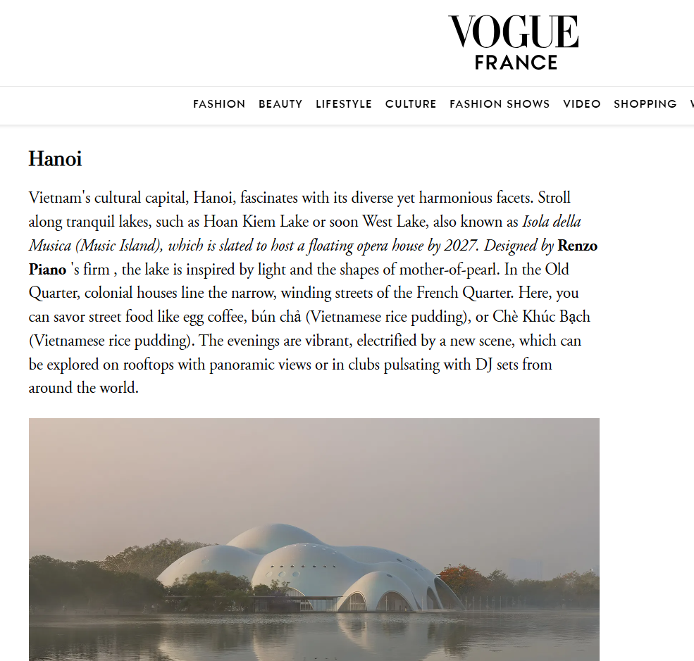 “Bên cạnh Hồ Gươm đã quá nổi tiếng, trong tương lai, du khách tới Hà Nội sẽ tản bộ bên Hồ Tây để chiêm ngưỡng ‘đảo âm nhạc’ – nơi một nhà hát opera trên mặt nước dự kiến khánh thành vào năm 2027”, Vogue mô tả. Tạp chí thời trang danh giá đặc biệt ấn tượng khi công trình được sáng tạo bởi công ty của kiến trúc sư lừng danh Renzo Piano, với thiết kế lấy cảm hứng từ ánh sáng và hình dạng của viên ngọc trai – biểu tượng của sự tinh khiết, sang trọng và trường tồn.