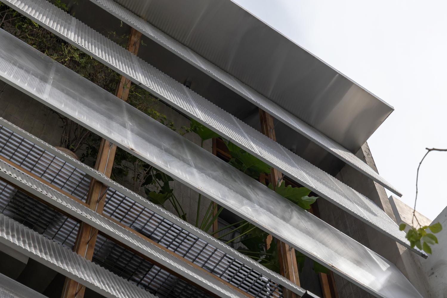 Mặt tiền được bao phủ bởi hệ thống lam chắn bằng polycarbonate trong suốt, được nghiêng và tạo hình với các họa tiết lượn sóng có kích thước khác nhau, tạo hiệu ứng ánh sáng dịu nhẹ vào ban đêm. Ban ngày, lớp vỏ hai lớp này lọc bức xạ mặt trời nhiệt đới đồng thời cho phép thông gió tự nhiên. Tên Lá-Sách - có nghĩa là cả "lá" và "sách", đồng thời gợi nhớ đến "lá sách" (lam chắn) trong tiếng Việt - phản ánh chất liệu và ý đồ đa lớp của dự án.
