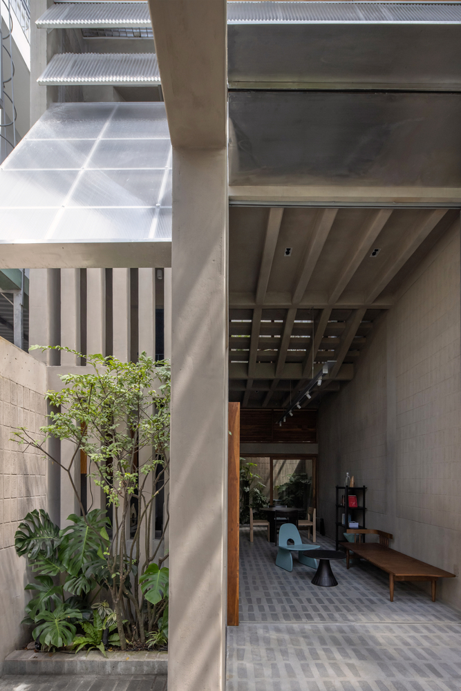 Về mặt vật liệu, dự án thể hiện sự quan tâm bền bỉ đến nghề thủ công. Gạch bê tông không nung, giá rẻ được cân đối cẩn thận và sắp xếp tỉ mỉ trên các bức tường; sàn đá terrazzo ra đời từ một quy trình đòi hỏi sự kiên nhẫn và chính xác từ bàn tay của các nghệ nhân.