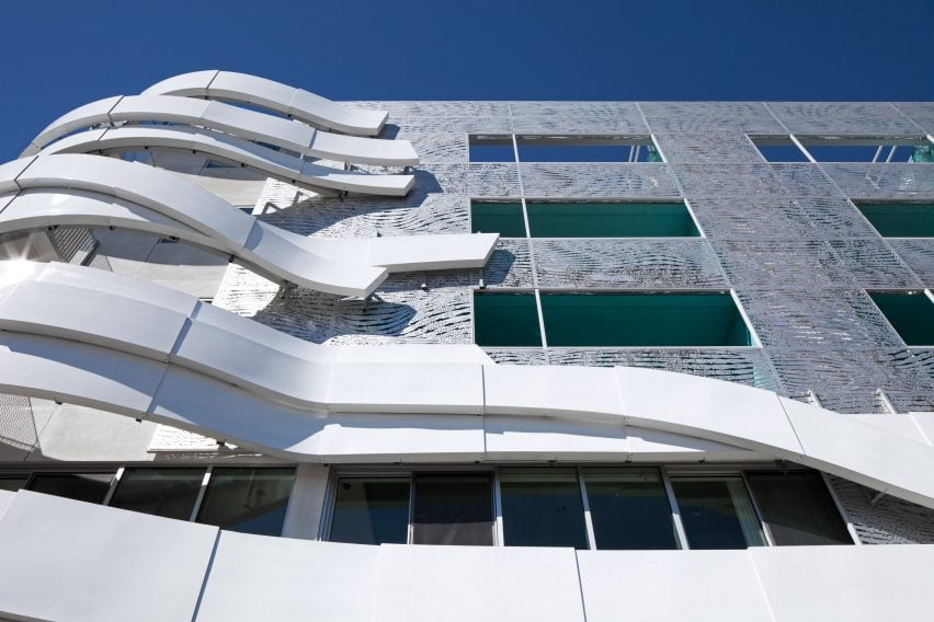 Thay vì chỉ cố gắng hòa nhập, Mutlow và Tighe đã làm cho tòa nhà trở nên nổi bật bằng cách bao phủ một phần tòa nhà bằng những dải ruy băng màu trắng đặc biệt.