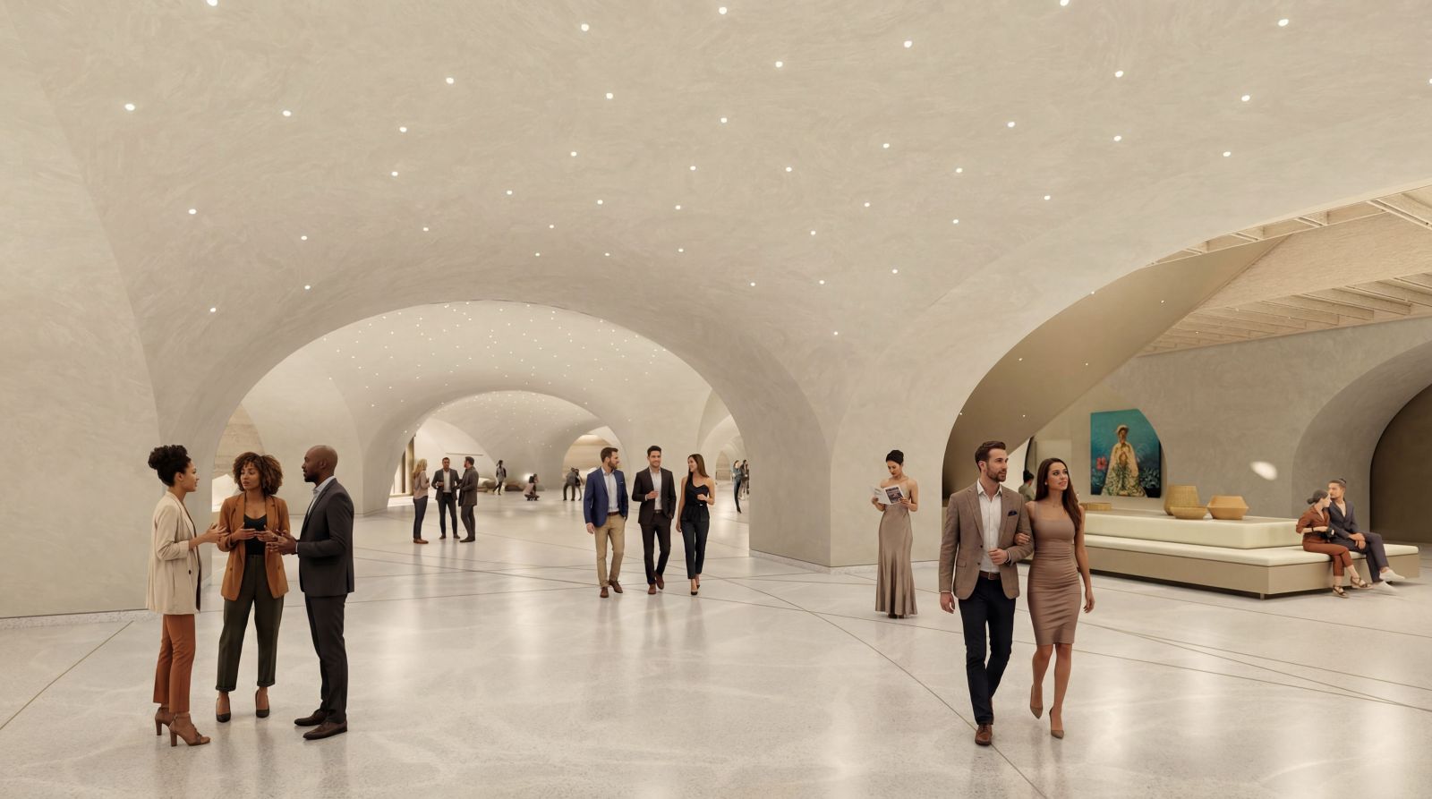 Khi bước vào bên trong, hành trình của huyền thoại tiếp tục được kể bằng ngôn ngữ nội thất, nơi mỗi không gian là một chương, mỗi trải nghiệm là một lớp cảm xúc. Không gian tầng 1 mở ra hành trình như bước vào lòng ngọc trai, một biểu tượng của Phú Quốc, với những vòm cong mềm mại bao bọc lấy không gian, ánh sáng dịu nhẹ gợi hiệu ứng như bề mặt ngọc trai đầy thanh lịch.