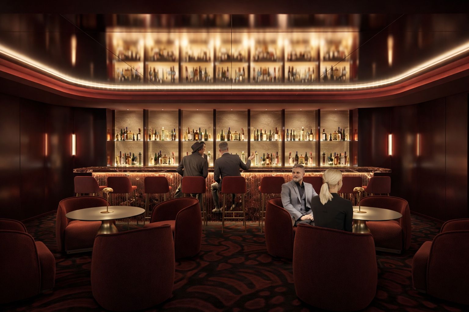 Quầy bar đóng vai trò là trung tâm thị giác, với hệ kệ rượu đèn nền tạo hiệu ứng nổi bật như một sân khấu thu nhỏ. Khu vực chỗ ngồi được tổ chức theo các cụm nhỏ, vừa đảm bảo tính riêng tư, vừa duy trì sự kết nối trong tổng thể. Vật liệu được lựa chọn tinh tế với nhung đỏ, kim loại ánh champagne và bề mặt đá vân nhẹ, tạo nên sự cân bằng hài hòa giữa sang trọng và cảm xúc. Tổng thể không gian không chỉ phục vụ chức năng nghỉ ngơi, mà còn góp phần kéo dài trải nghiệm trước và sau buổi diễn.