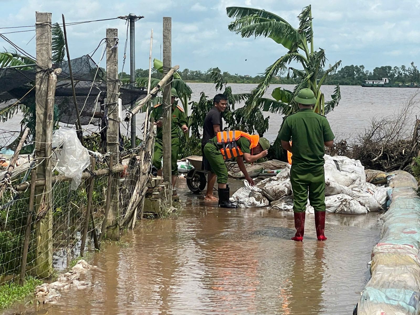 Lực lượng công an và dân quân địa phương khẩn trương gia cố đê bối Mỹ Tân (cũ), phường Thiên Trường, trong tình thế mực nước sông Hồng dâng cao.