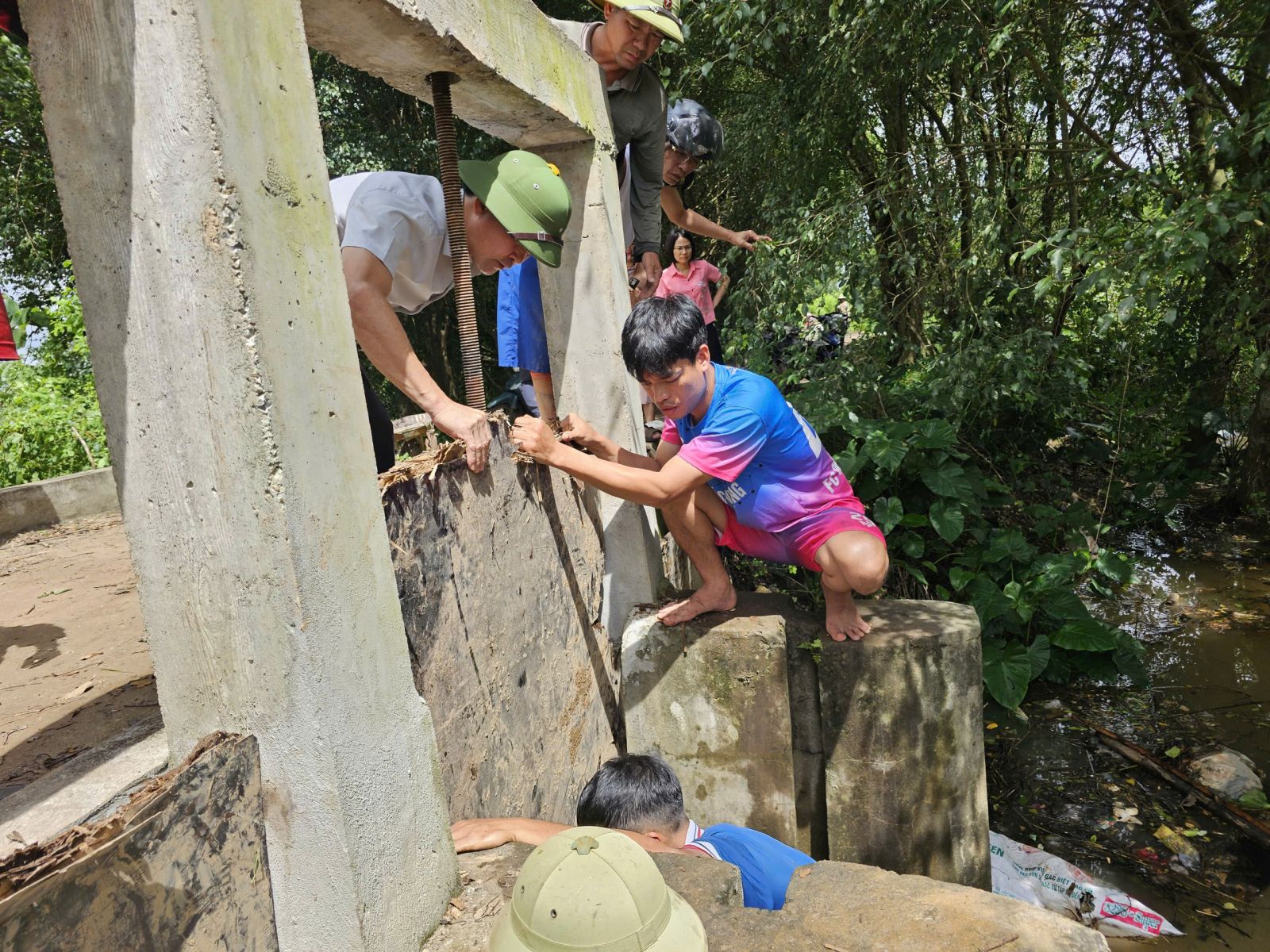 Lực lượng dân quân tự vệ khẩn trương gia cố hệ thống cống, ngăn nguy cơ ngập úng.