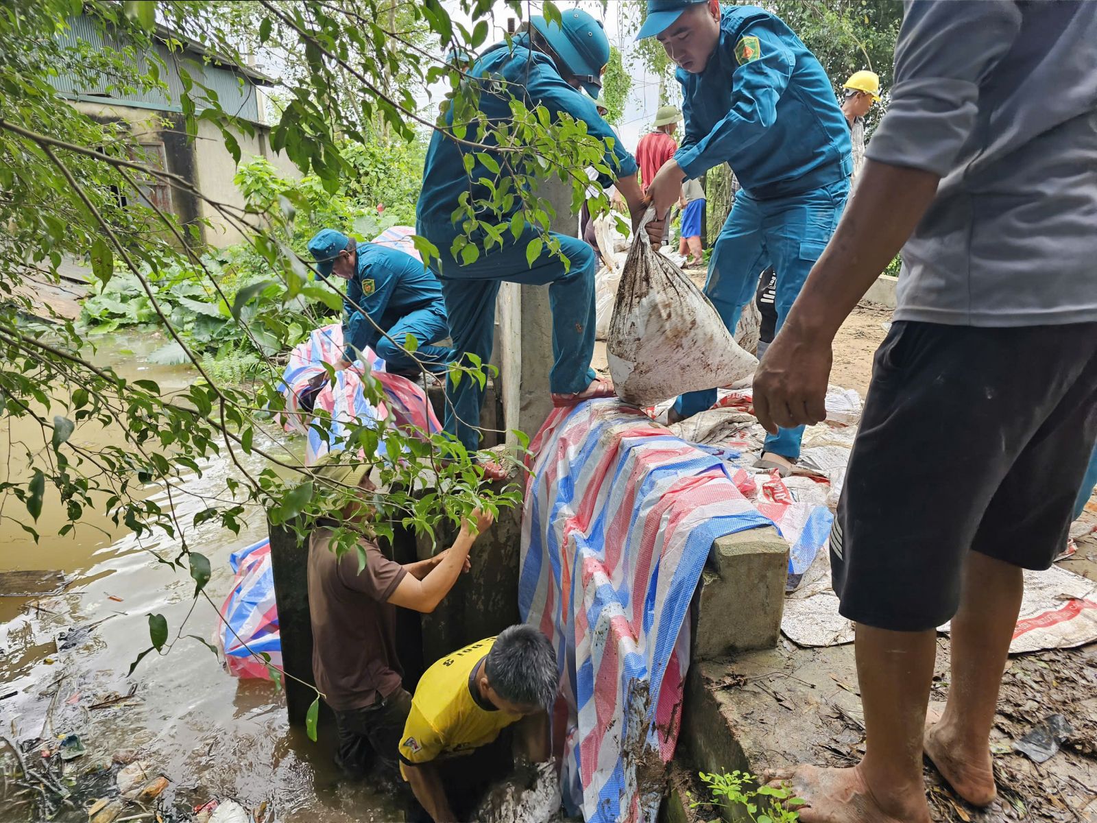 Dân quân tự vệ cùng nhân dân gia cố điểm xung yếu bằng bao tải cát, tăng cường khả năng chống tràn nước lũ.