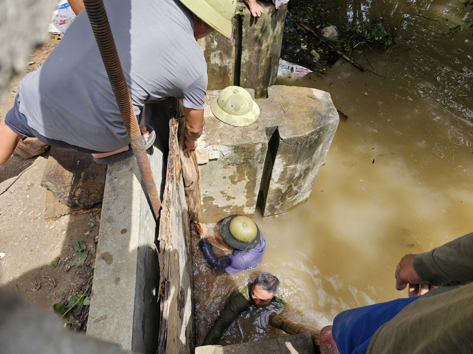 Lực lượng tại chỗ không quản ngại khó khăn, trực tiếp xuống dòng nước gia cố các điểm nứt, ngăn nguy cơ vỡ đê.