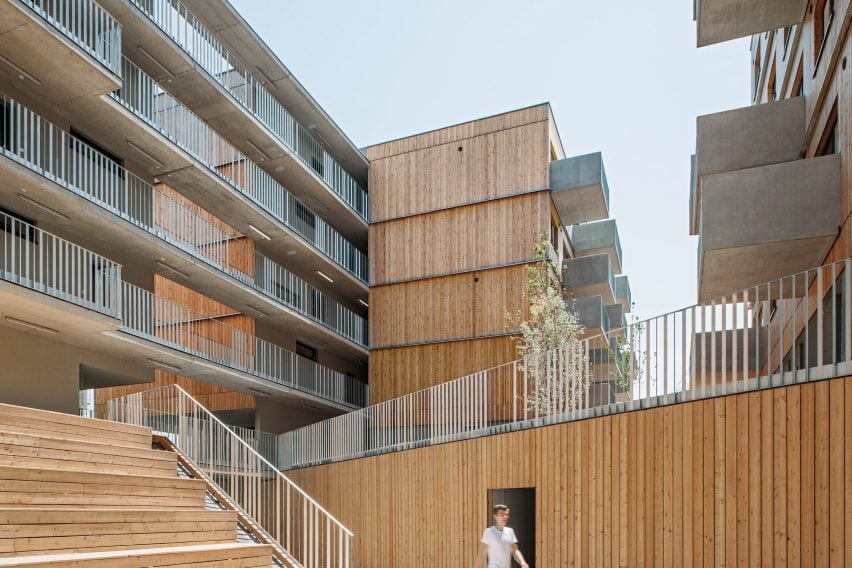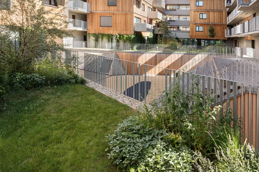 Sân trong bán công cộng ở trung tâm này – được studio gọi là "hẻm núi" – cung cấp không gian cho cư dân "trải nghiệm cộng đồng", với các khu vực họp mặt và không gian vui chơi cho trẻ em được bao quanh bởi khu vực chỗ ngồi có bậc thang và được bao quanh bởi các bức tường ốp gỗ dốc.