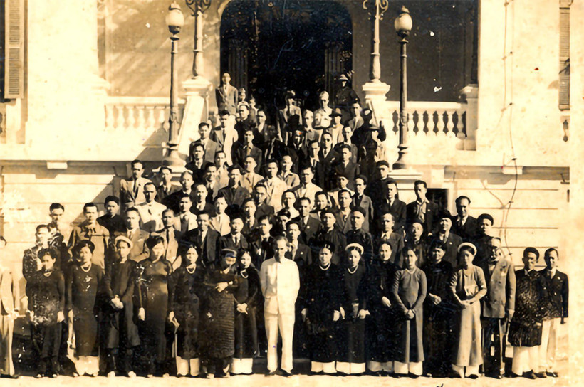 Chủ tịch Hồ Chí Minh chụp ảnh lưu niệm với các nhà tư sản Hà Nội trước Bắc Bộ Phủ, ngày 18/9/1945. (Nguồn: ditichhochiminhphuchutich.gov.vn)