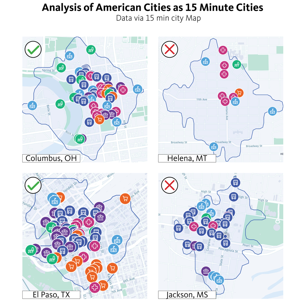 Cùng với Paris, Melbourne đã tạo ra một khu phố riêng với chỉ 20 phút di chuyển, nơi mọi thứ đều nằm trong phạm vi 20 phút di chuyển. Copenhagen, có lẽ là một ví dụ nổi tiếng hơn, đã tập trung ý thức đô thị của mình vào việc phụ thuộc vào xe đạp với một lớp gần với những địa điểm mong muốn. Ngay cả các thành phố của Mỹ hiện cũng đang xem xét kỹ lưỡng hơn phương pháp này, đặc biệt là với những bài học kinh nghiệm và sự tự phản ánh khi đại dịch COVID-19 hướng đến những tương lai mới. Vào thời điểm mọi người thường dành 1-2 giờ mỗi ngày chỉ để đi làm bằng các phương tiện giao thông cá nhân, thì việc trả lại đường phố cho người dân đang được chú trọng hơn, tìm cách giảm bớt sự phụ thuộc nặng nề vào ô tô và tái tạo lại cảm giác khu phố đã bị suy giảm do sự gia tăng đô thị hóa. Here Technologies đã tạo ra một bản đồ tương tác cho thấy những thành phố nào đang nghiêng về phía phù hợp hơn với các mục tiêu thành phố 15 phút. Mặc dù một số khu phố hiện có thể đi bộ được, nhưng nhiều khả năng sẽ có nhiều khu phố hơn nữa chuyển sang hướng này khi các nhà quy hoạch đô thị bắt đầu sử dụng khuôn khổ này để phát triển các khái niệm thành phố tương lai của riêng họ.