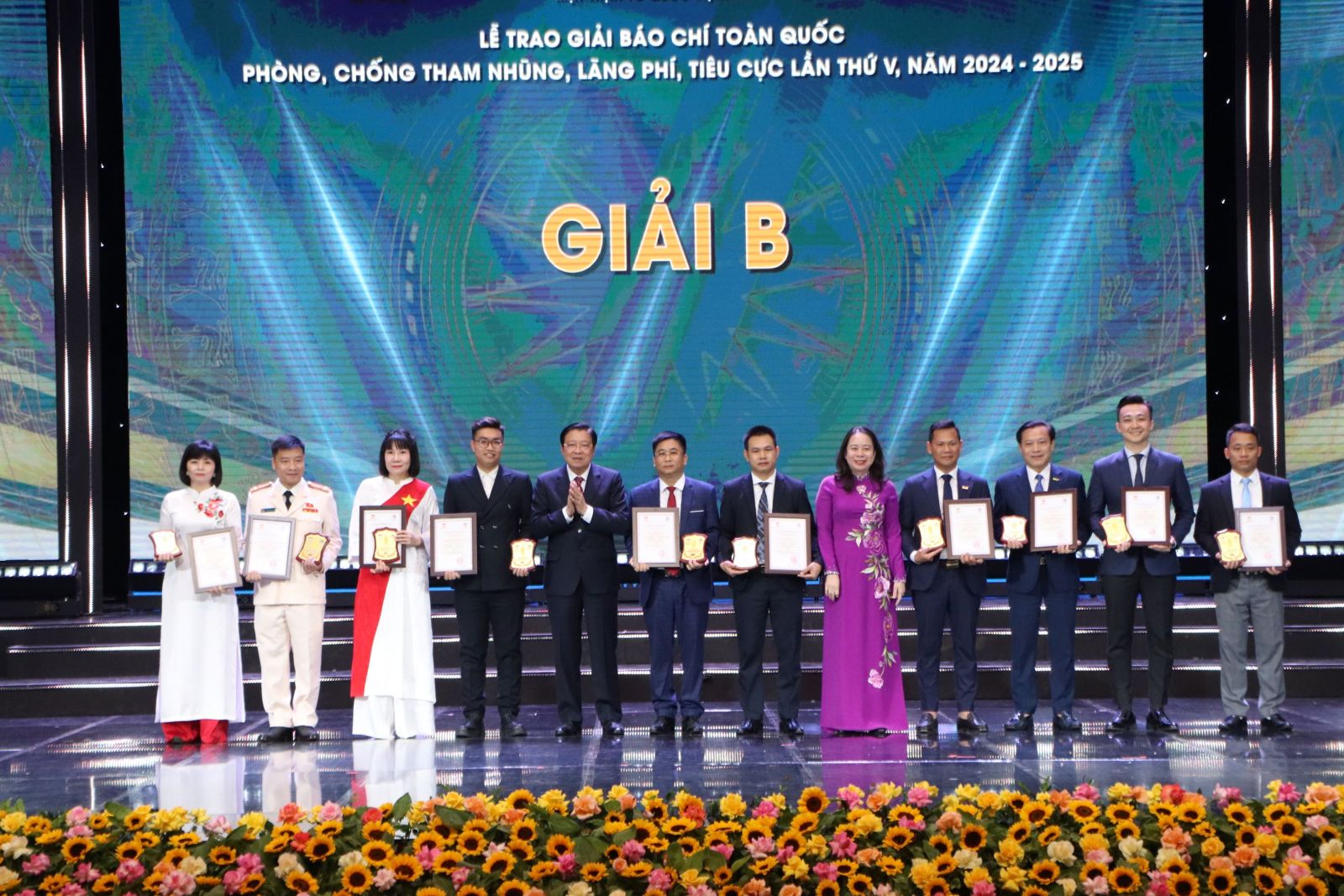 Trưởng Ban Nội chính Trung ương Phan Đình Trạc và Phó Chủ tịch nước Võ Thị Ánh Xuân trao giải B cho các tác giả, nhóm tác giả đoạt giải.