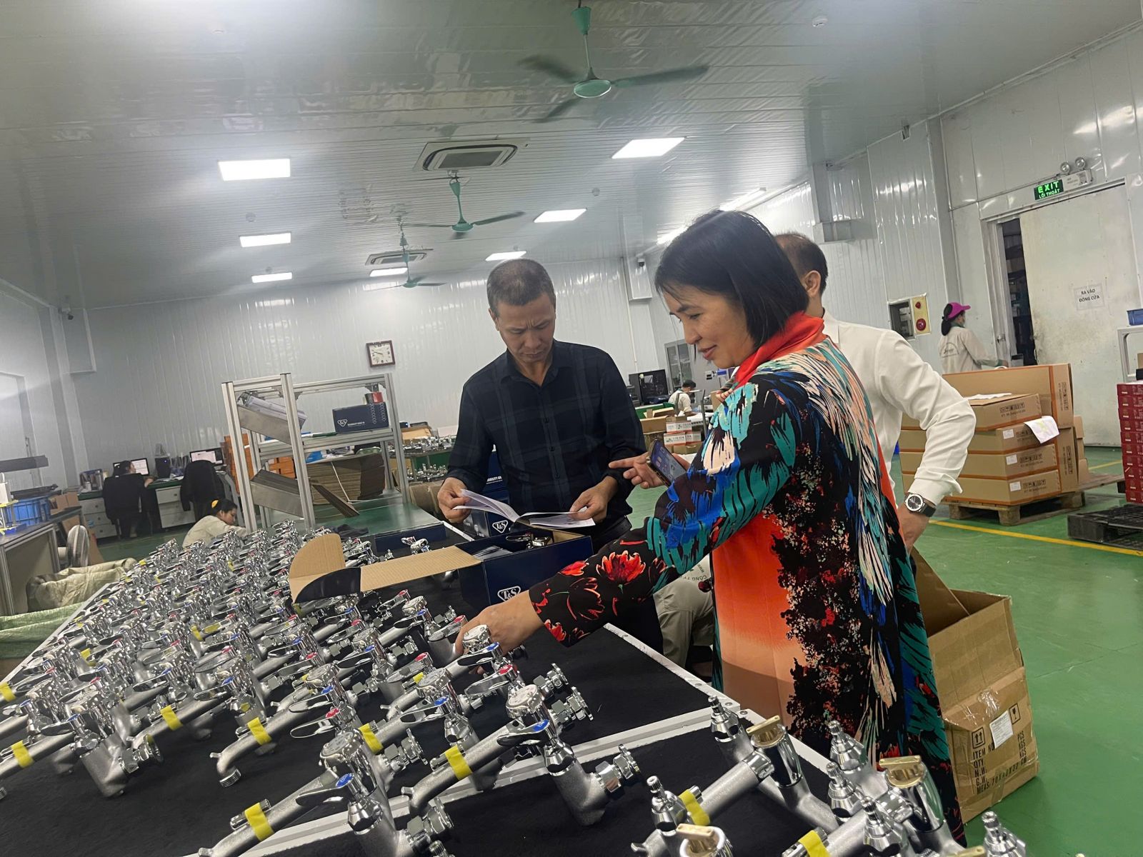 Đoàn công tác Tạp chí Kiến trúc Việt Nam nghe ông Ngô Duy Hòa – Tổng Giám đốc Công ty Cổ phần Brasler Việt Nam giới thiệu về dây chuyền sản xuất và các sản phẩm vòi hoa sen hoàn thiện tại nhà máy.