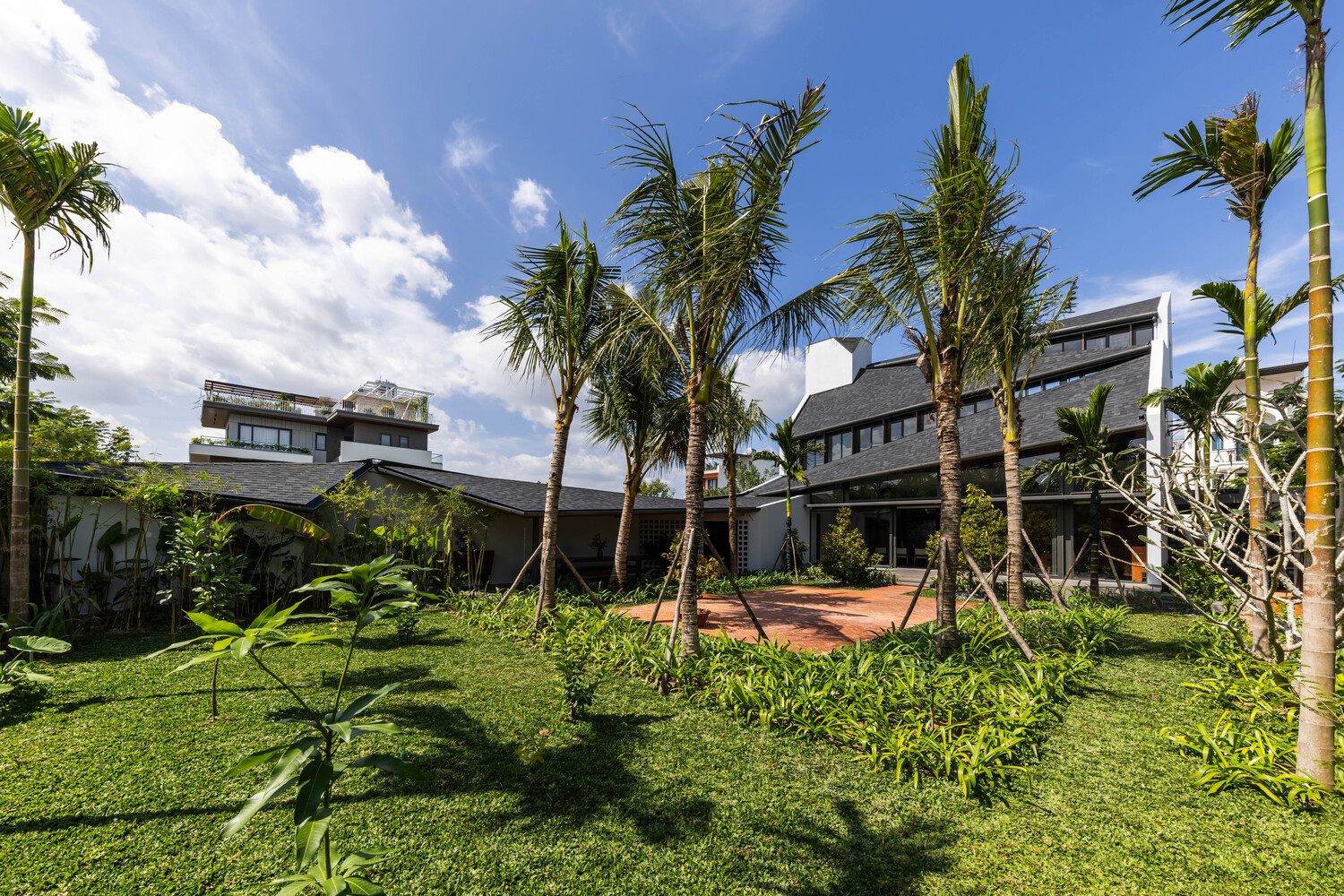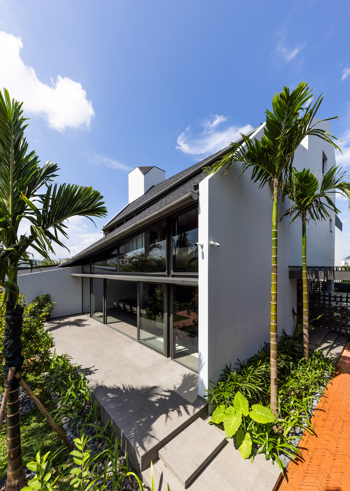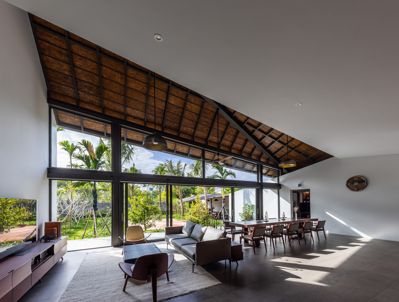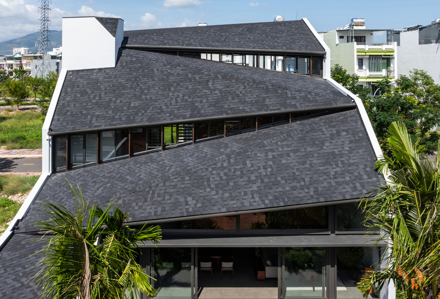 Chúng tôi đề xuất một loạt mái nhà trải dài giữa hai bức tường chính, giống như một tấm vải căng trên một khung cứng. Chiến lược này tạo ra một mặt bằng mở gần như không có cột. Những mái nhà này bao phủ cả không gian bên trong và bên ngoài, tạo ra một không gian sống liền mạch duy nhất trải dài từ khu vườn dưới đất lên đến tận phòng làm việc trên tầng cao nhất. Về cơ bản, các thành viên trong gia đình sẽ bước vào không gian chung nhiều tầng này ngay khi họ rời khỏi phòng ngủ.